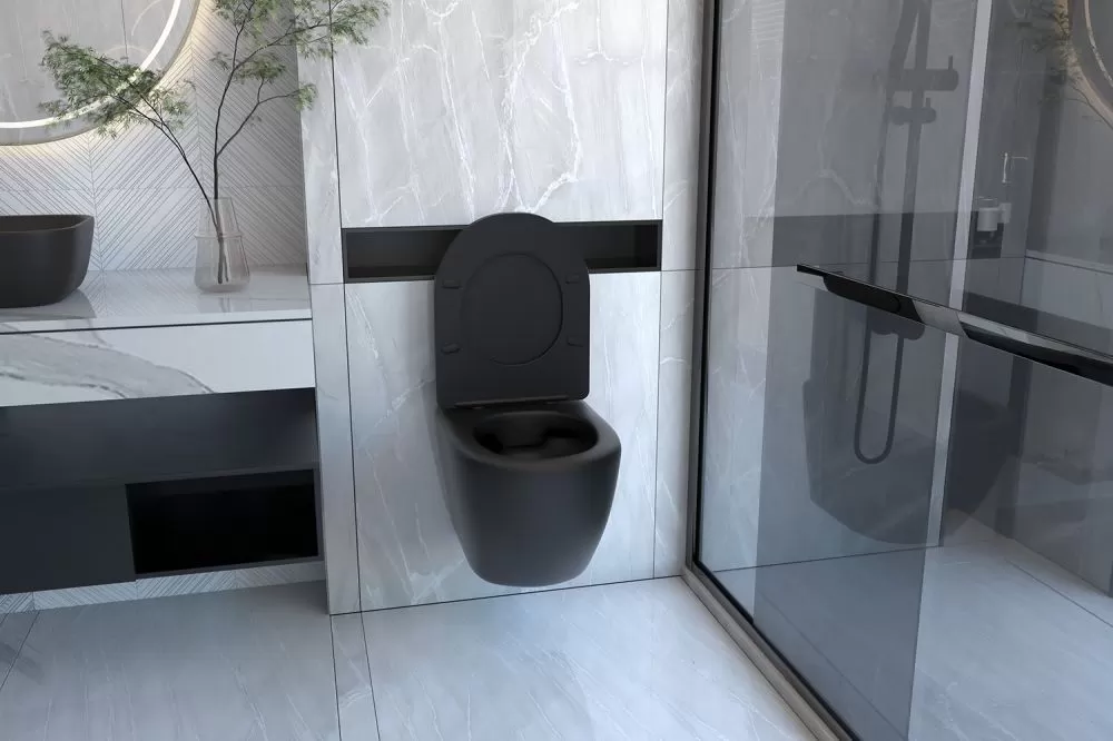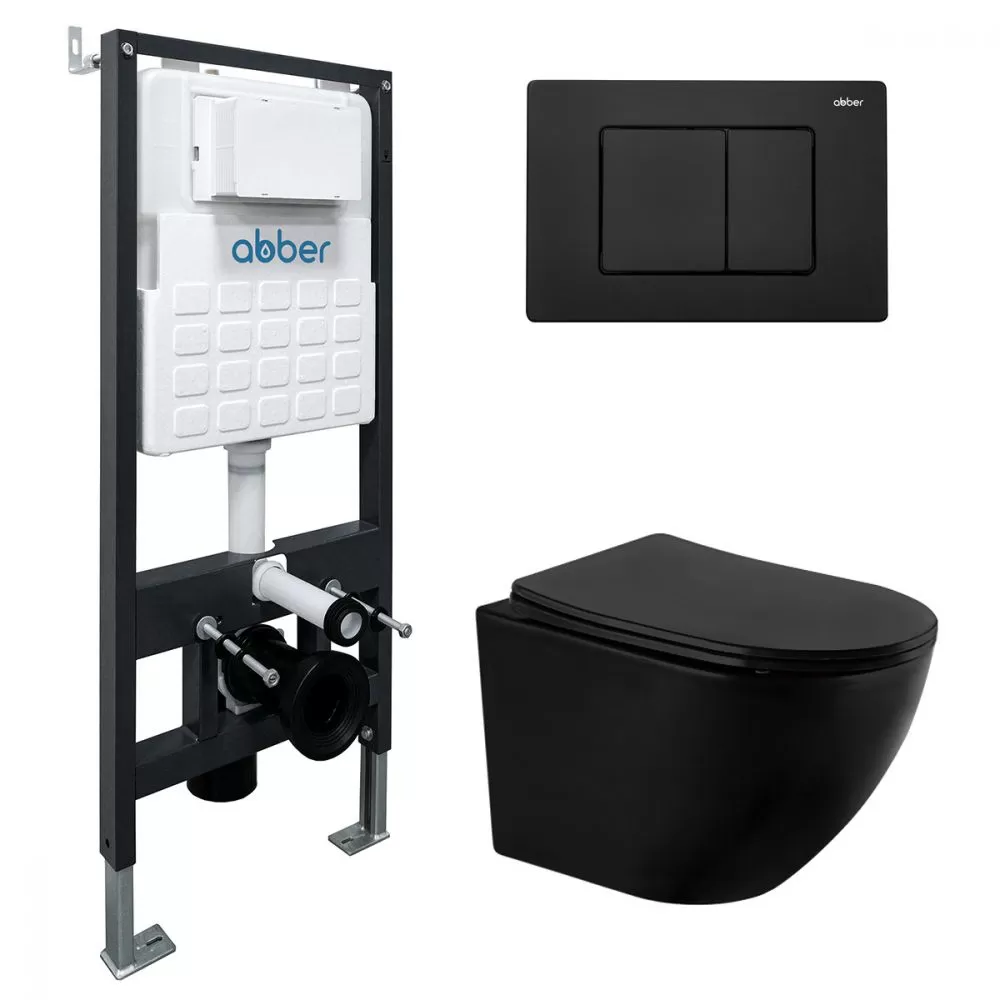 Комплект подвесной унитаз ABBER Bequem AC1100MB черный матовый с инсталляцией AC0105 и кнопкой AC0120MB черная матовая