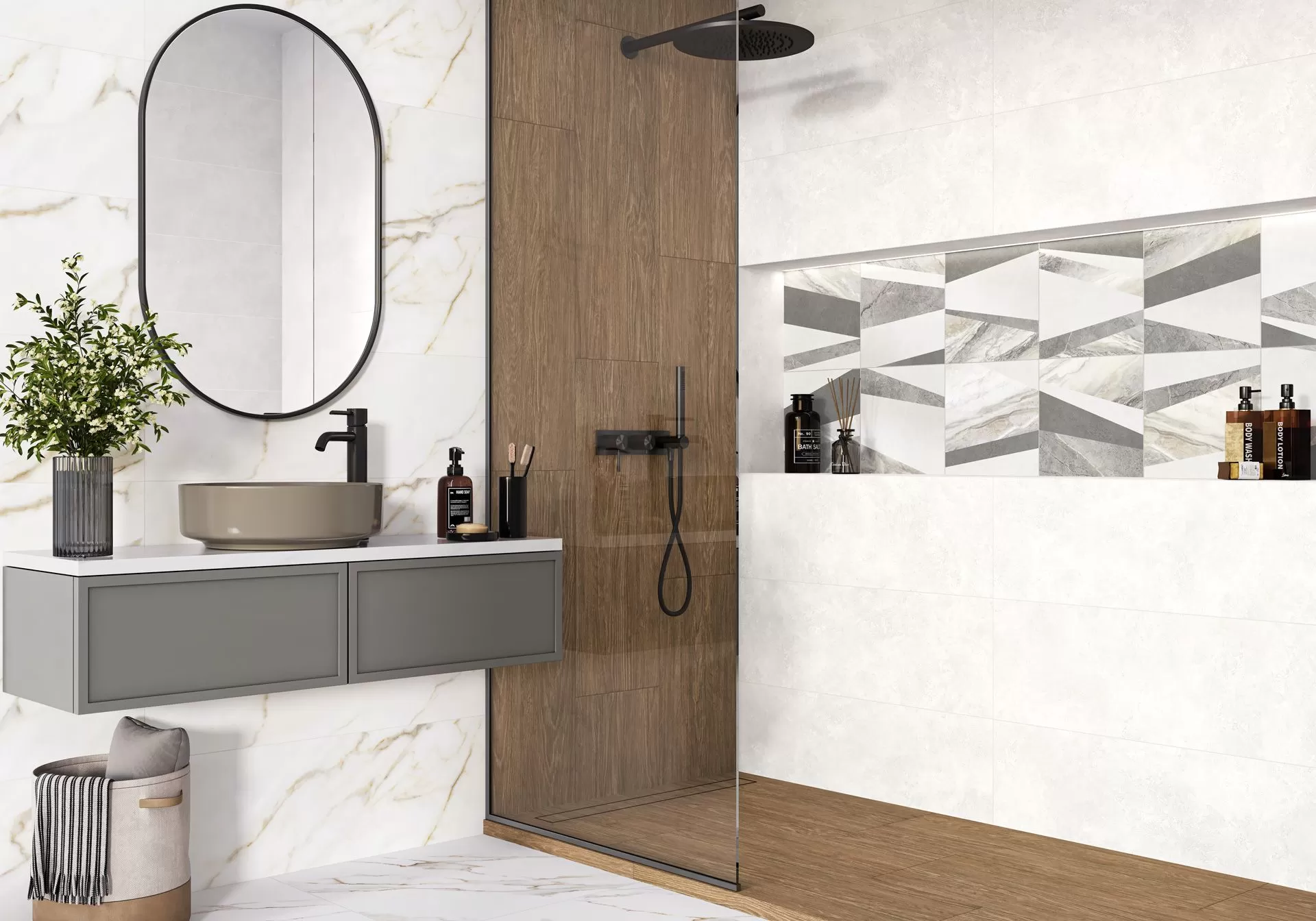 Коллекция настенной плитки Anturin в формате 300x900 мм., где благородство белого и серого мрамора переплетается с урбанистическим шармом двух оттенков бетона. Цветовая палитра коллекции выполнена в бело-серых оттенках, они создают атмосферу утонченной элегантности. Акцентными элементами серии являются два вида декоративного массива: оригинальная геометрия с футуристичными яркими акцентами и классическая нарезка с текстурами базовых плиток, демонстрирующая богатство природных текстур. Все элементы произведены с матовой поверхностью, а также имеют ректифицированный край. Дополняют серию платиновый бордюр, ректифицированный керамогранит в формате 600x600 мм и керамогранит с деревянной текстурой в формате 200x900 мм. Вариативность элементов коллекции позволяет создать разный дизайн в помещениях, но в единой концепции. Таким образом получается готовое решение для всей квартиры или дома в рамках одной коллекции.