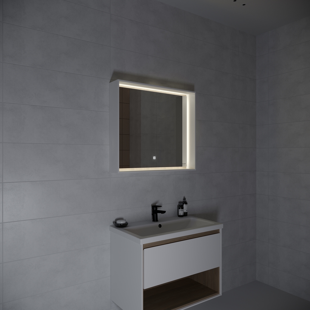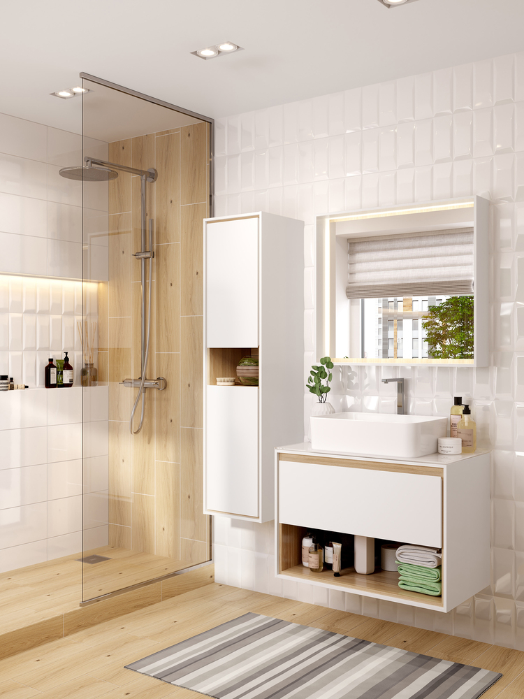 LOUNA – это коллекция, отвечающая последним тенденциям рынка: сочетание чистоты белого цвета и натурального дерева. Основной отличительной особенностью коллекции является её дизайн – сочетание белого с деревом, фрезерованная ручка, выдвижной ящик и удобная открытая полка для хранения. Пенал оборудован стеклянными полками и открытой нишей. Зеркала в коробе ЛДСП оборудованы сенсорной подсветкой.