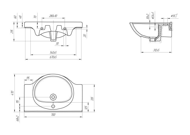 Мебельная раковина ERICA с отверстием под смеситель, размер раковины 70 см.