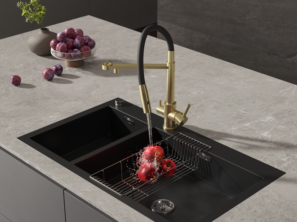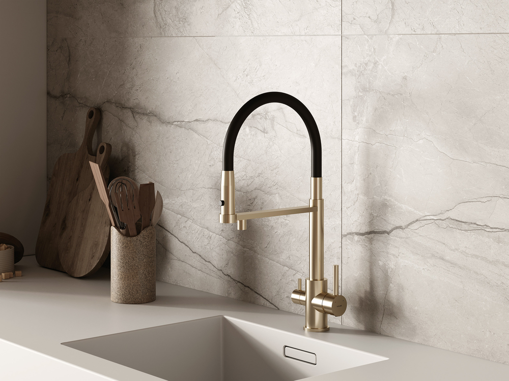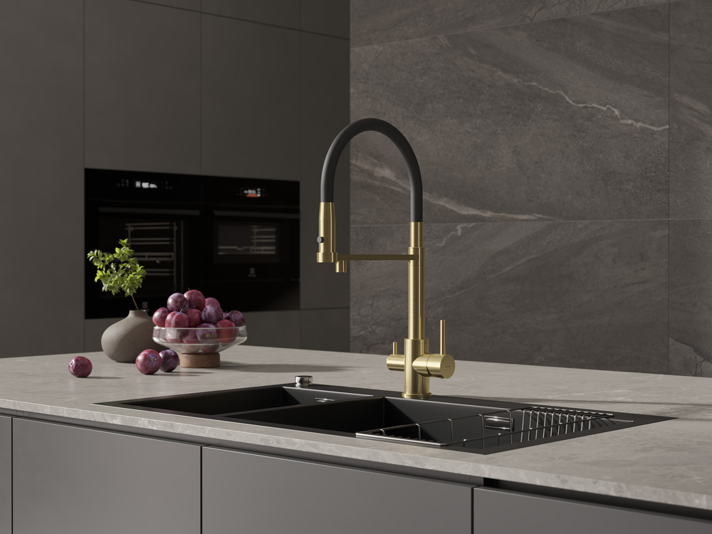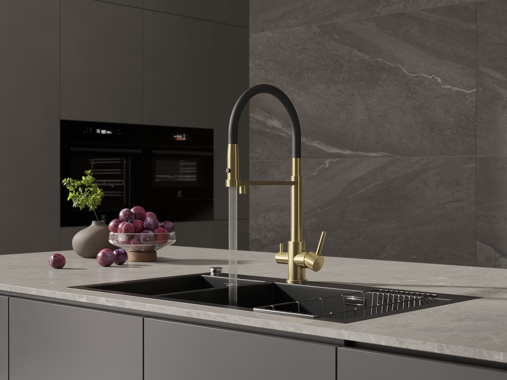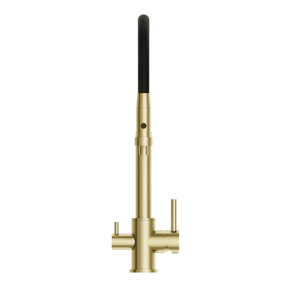 Смеситель для кухни ZEN однорычажный с подключением фильтра с гибким изливом золотой