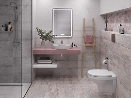 Композиция обладает всеми инструментами для создания дизайнерской ванной комнаты без дизайнера: «бетон», «металл», «дерево», «кабанчик», рельефный глянец и колоритные испанские мотивы. Яркий винтажный керамогранит SEVILLA, имитирующий формат 20х20, подходит для укладки на пол и стены и создаст тёплую атмосферу южного города. Трендовые керамогранитные «доски» SANDWOOD формата 18х60 также универсальны.