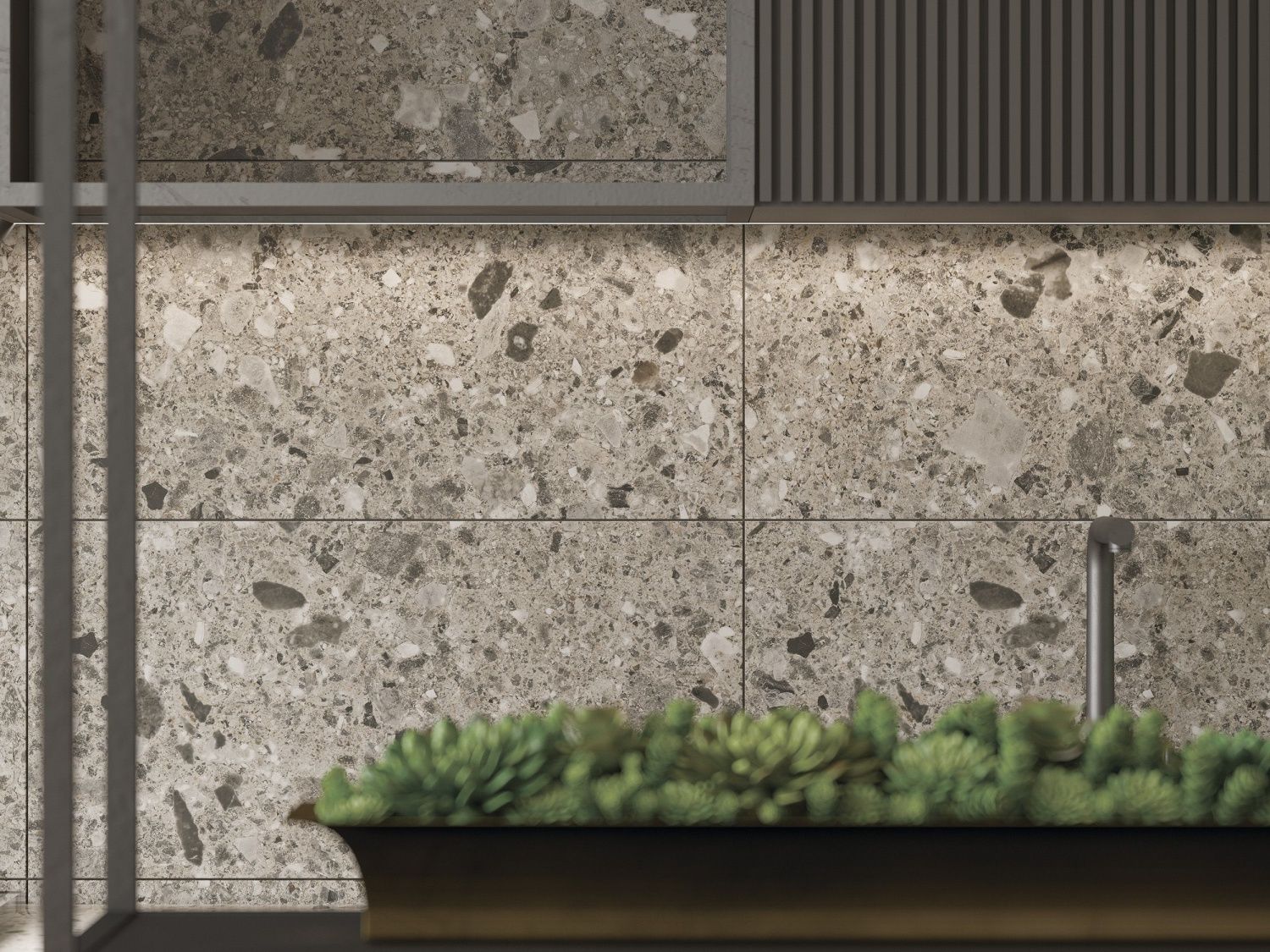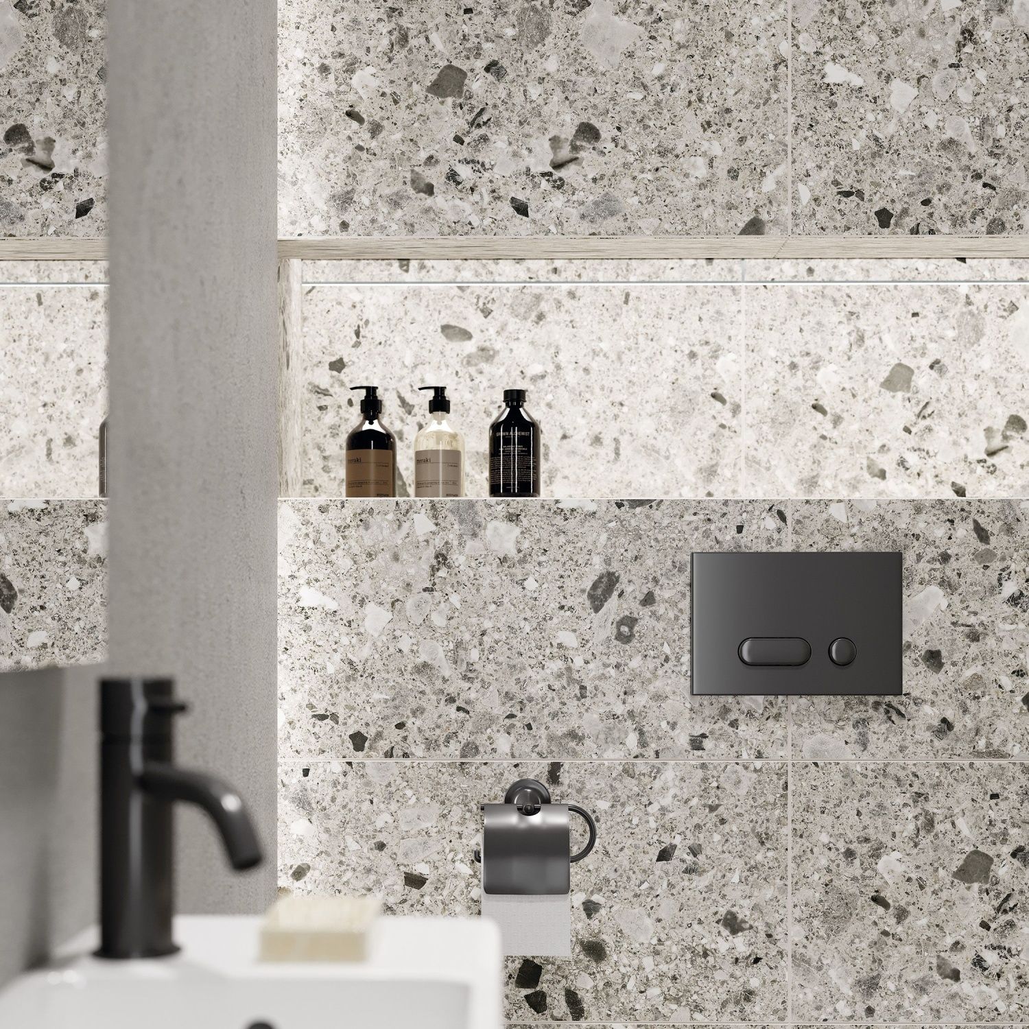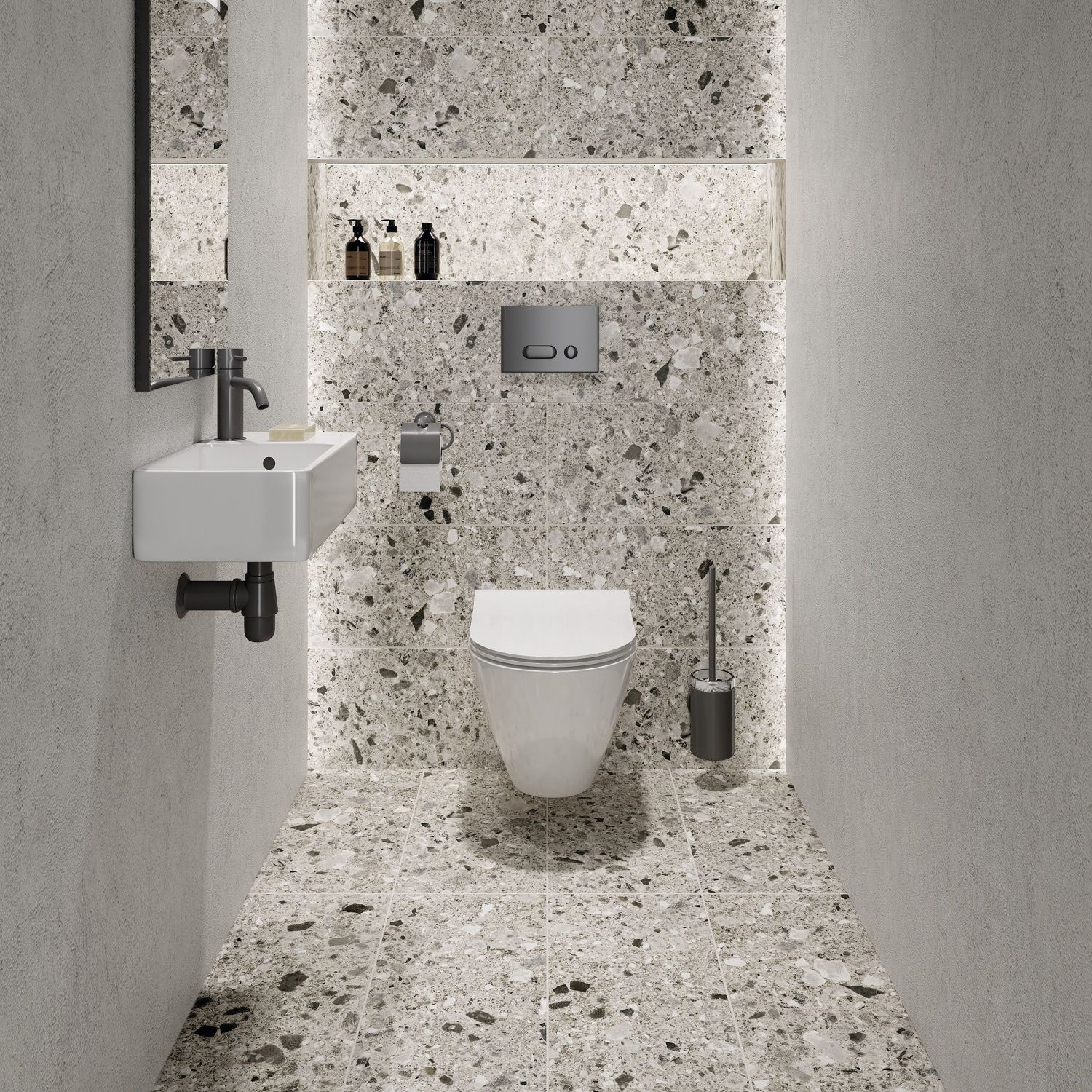 Вселенная венецианского терраццо нашла воплощение в коллекции SPACE. Матовая поверхность с изящными вкраплениями блестящих эффектов в спокойный серый фон плитки станет стильным дополнением интерьера как санузла, так и гостиной комнаты. Плитку из этой коллекции можно использовать и в качестве декора, и как самостоятельную единицу. Солидный запас прочности керамогранита позволяет облицовывать им стены и укладывать на пол без риска для внешнего вида материала в течение всего срока эксплуатации.