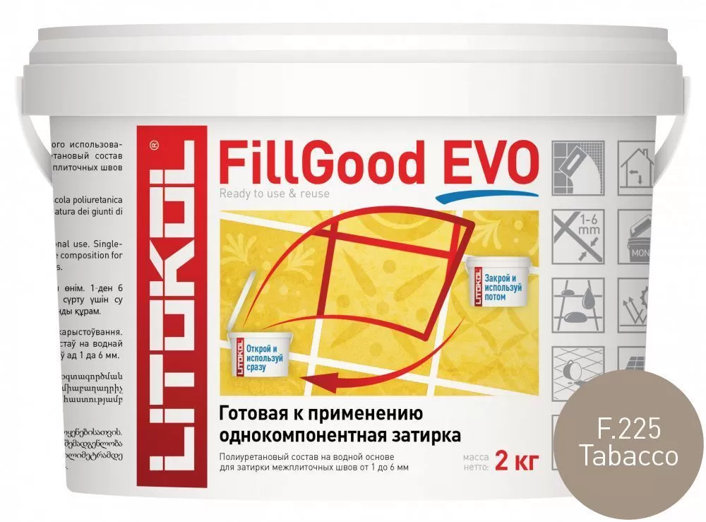 Litokol FillGood EVO F.225 Tabacco 2 кг - готовый к применению инновационный однокомпонентный полиуретановый состав на водной основе для затирки швов керамической плитки, керамогранита и стеклянной мозаики шириной от 1 до 6 мм с водоотталкивающим эффектом.