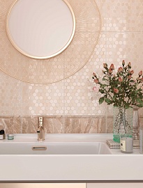 Глянцевая коллекция Venice в формате 300×600 мм — это золотистый оникс в керамическом исполнении. Тёплые солнечные оттенки будут поднимать настроение и создавать уют. Оригинальный декор на полудрагоценном камне станет украшением интерьера. Особенность этого декора в том, что он стыкуется, создавая на стене единую геометричную сетку. В декоре использованы нежные и оригинальные материалы: зеркальный люстр, перламутровый металлик, мерцающий глиттер и интерферентная паста, которая меняет свой цвет в зависимости от угла падения световых лучей. Керамический бордюр 13×600 мм в цвете золота и лаппатированный керамогранит 600×600 мм являются завершающим дополнением коллекции.