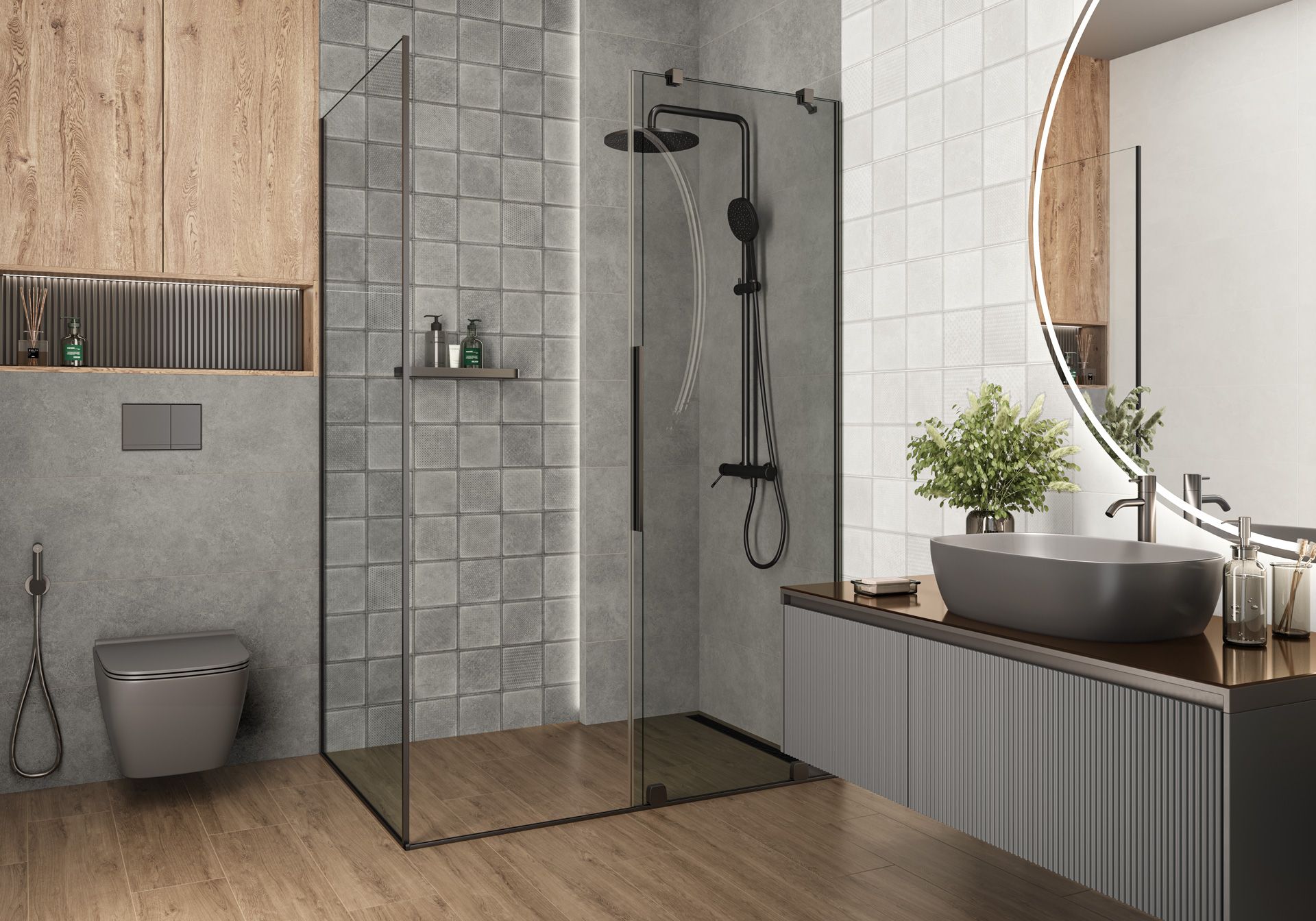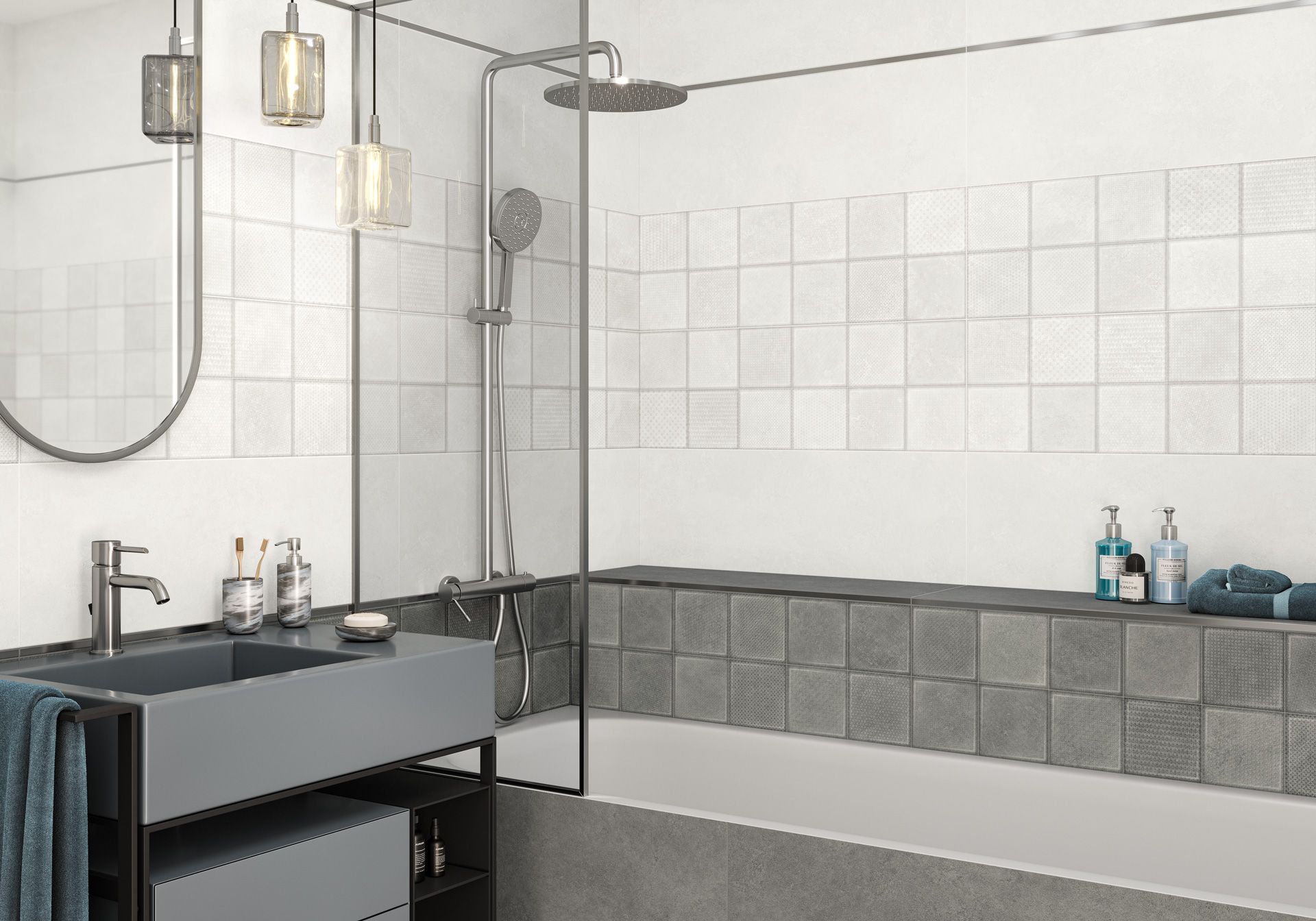 Коллекция настенной плитки Cube произведена в формате 300x900 мм, в серой цветовой гамме. Два цвета базовых плиток дополняются декоративными массивами в виде монохромного пэчворка с элементами принтов с имитацией шва. Спокойный, но вместе с тем запоминающийся дизайн будет уместен в таких дизайнерских стилях, как минимализм, нео-мемфис, лофт и контемпорари. Все плитки коллекции произведены в матовой поверхности. Такой дизайн можно применить как в домашнем интерьере, так и в общественных пространствах. Плитка имеет ректифицированный край, он является дополнительным преимуществом, позволяющим осуществить укладку с минимальным швом. В состав коллекции входит платиновый бордюр и напольный компаньон в виде керамогранита с текстурой бетона в формате 600x600 мм, также предлагается керамогранит с текстурой дерева в формате 200х900 мм.