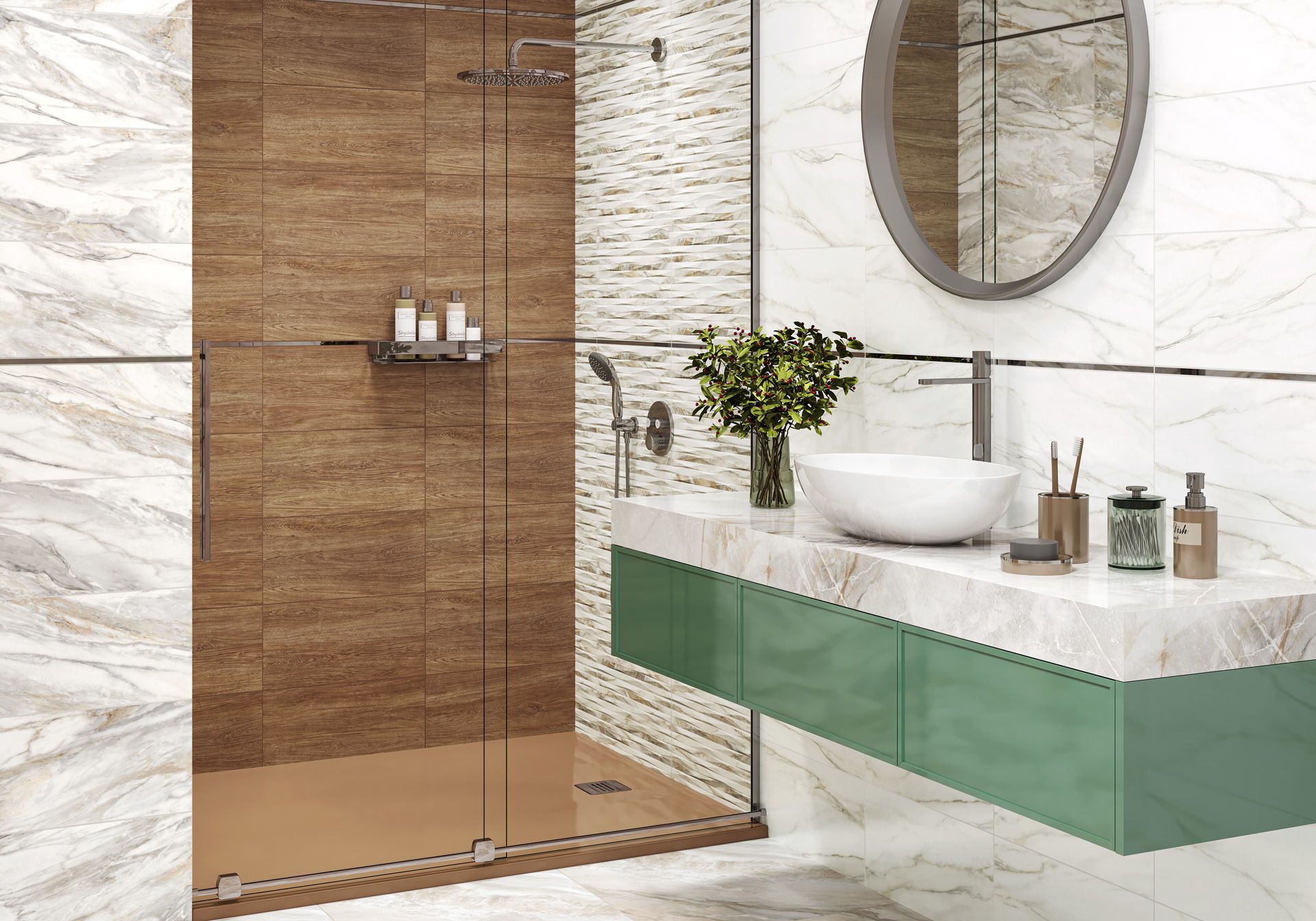 Настенная плитка Euphoria — это симбиоз природных текстур, где дерево, благородные текстуры мрамора и рельеф создают гармоничный дизайн пространства. Артикулы произведены с матовой поверхностью и имеют как базовые плитки без рельефа, так и акцентные рельефные артикулы. Базовые плитки это два вида мрамора, один — классический белый с деликатной прожилкой, второй — акцентный серо-бежевый. Также базовым дополнением являются две деревянные текстуры: беленый дуб и рыже-коричневая текстура тикового дерева. Изюминкой коллекции выступают три декоративных массива на рельефе с текстурами мрамора и дерева. Рельеф представляет собой плашки в виде геометричных ломанных линий с эффектом 3D, при укладке этой плитки важно определить направление, чтобы эффект объёма был заметен. Все плитки коллекции сочетаются между собой.