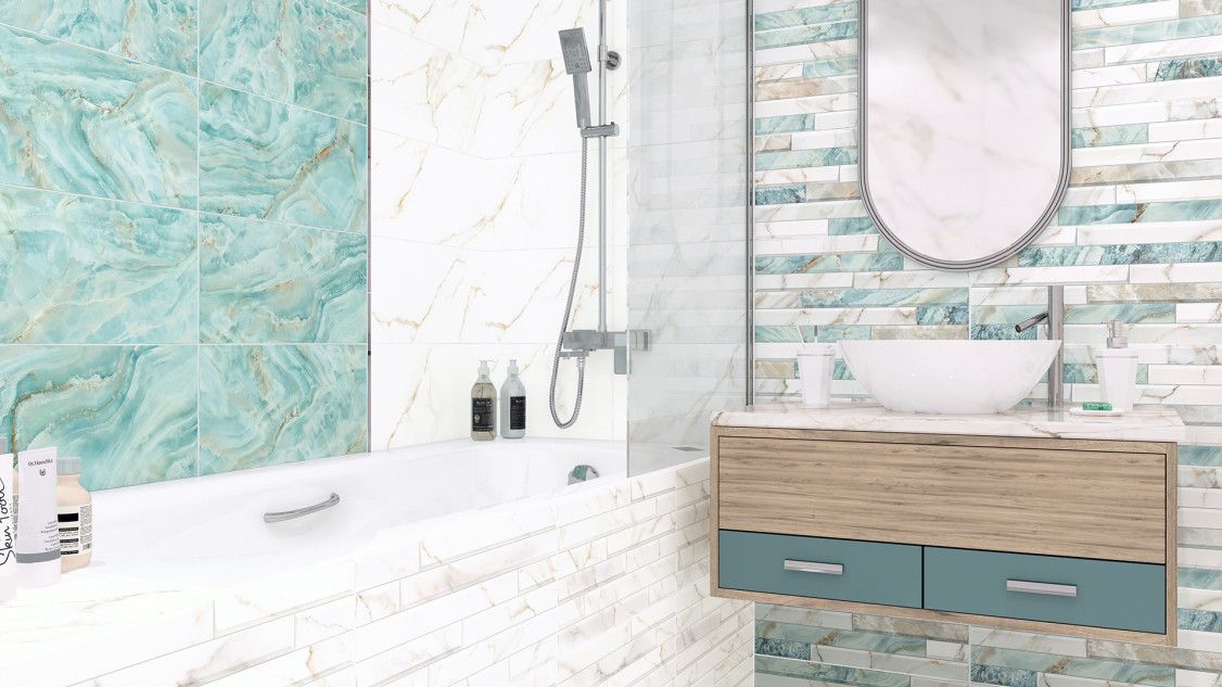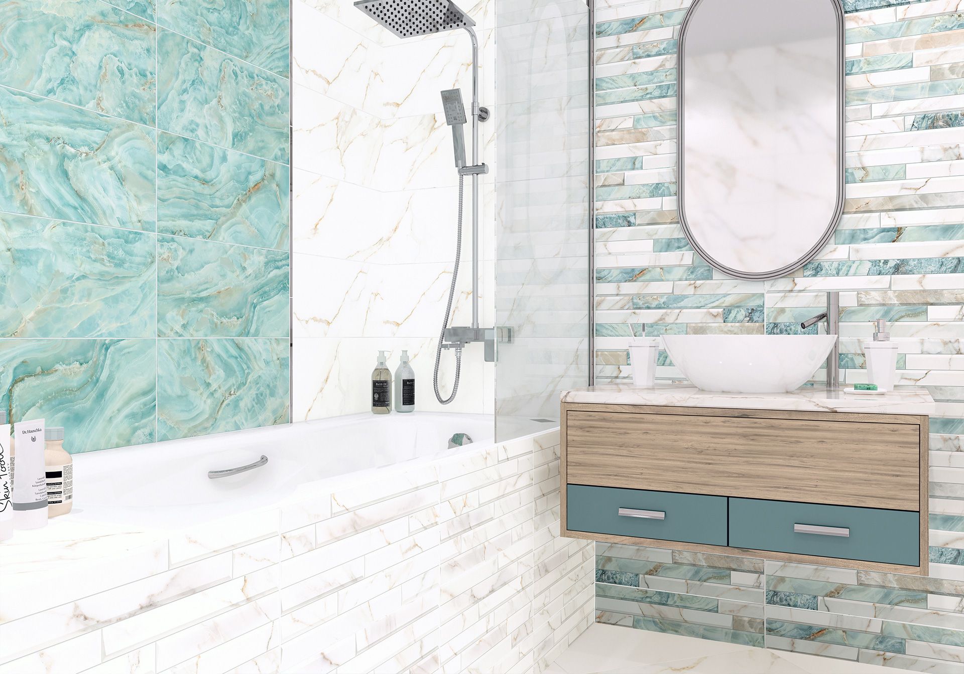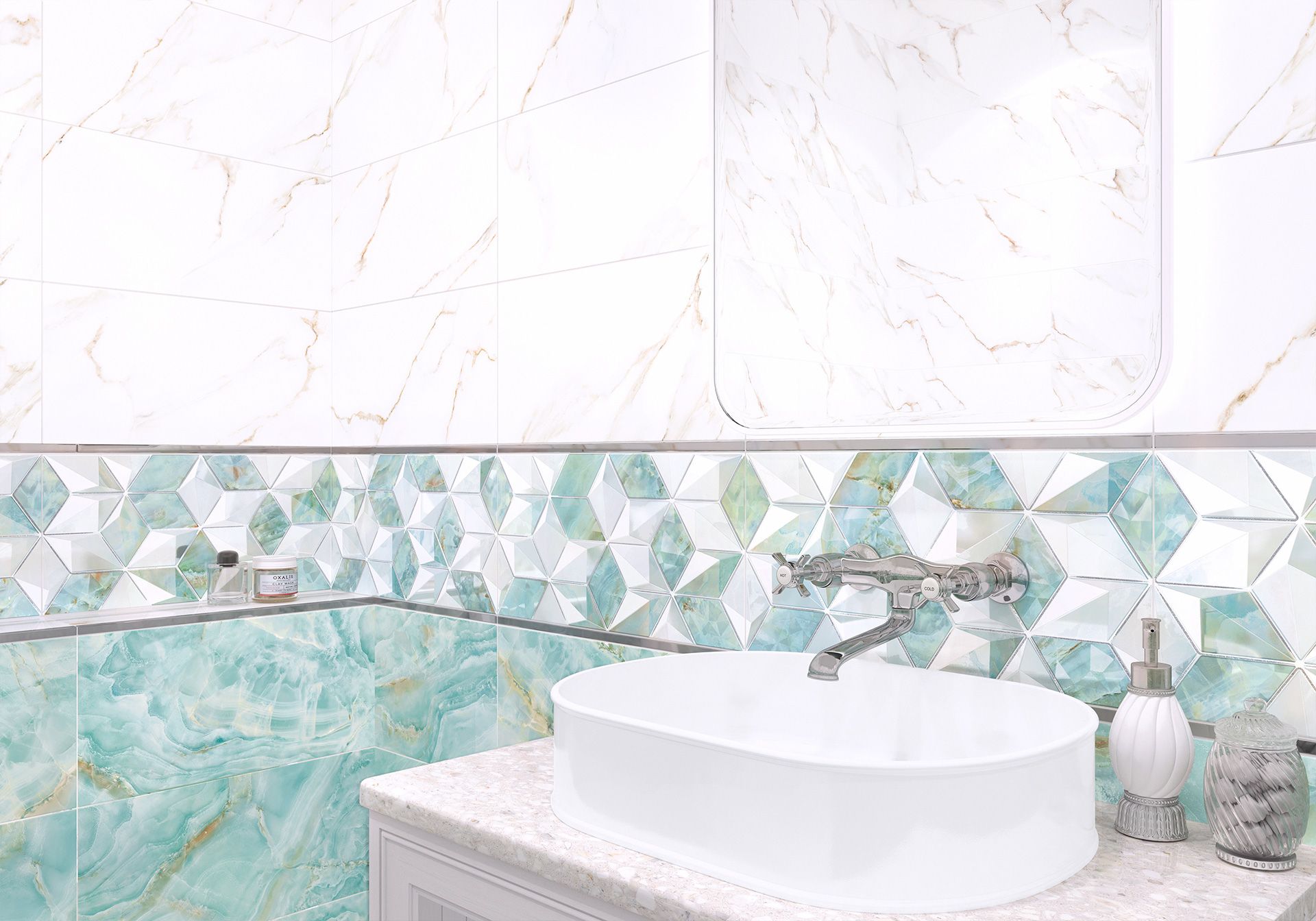 Базовая плитка холодной гаммы представлена в натуральном оттенке оникса Emerald и декоративным массивом с 3D-рисунком в виде объемной нарезки. Декором с узором стилизованного геометрического цветка бирюзовых и жемчужных оттенков, украшенного утонченными серебристыми линиями и зеркальным эффектом люстра.