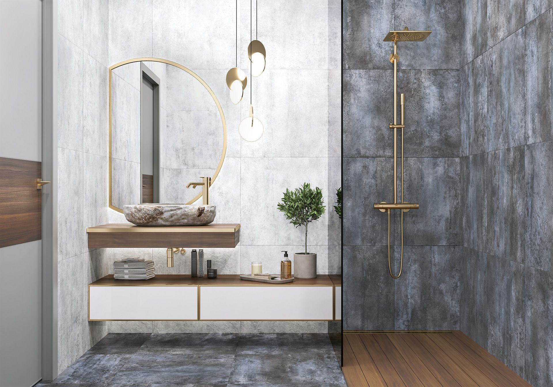 Особенная серия Oxide представлена шестью разными оттенками металла: светло-серым, бежево-голубым, графитовым, иссиня-серым, насыщенно-коричневым, и бирюзово-коричневым. Для создания этой текстуры в нашу лабораторию были доставлены фрагменты промышленных металлических листов, графику которых получилось перенести на поверхность керамогранита и произвести яркие, многоцветные градиенты оксидного металла. Керамогранит имеет безопасную и практичную рельефную фактуру, которая дополнена блестящим спецэффектом deep-ink, который эффектно смотрится на металлической поверхности.