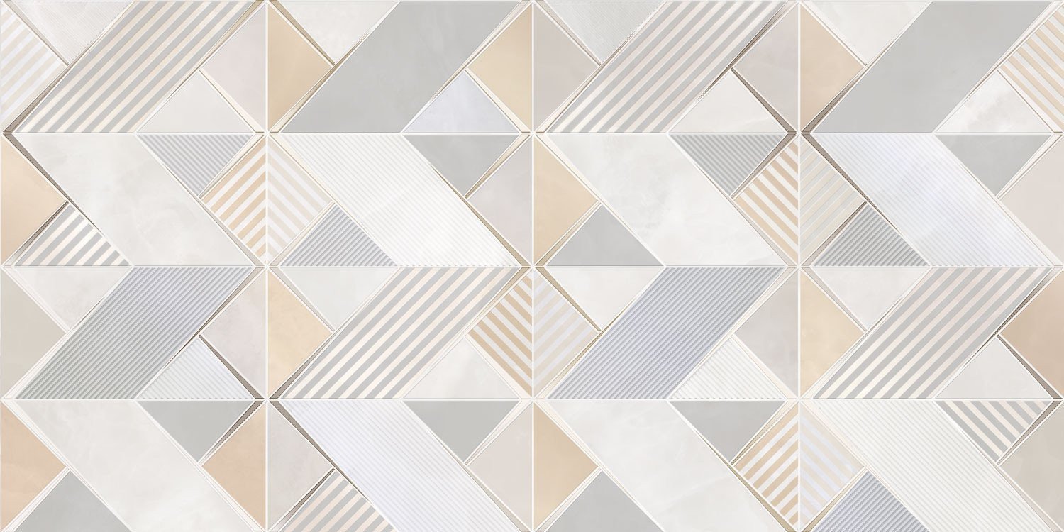 Настенная вставка Rivoli декор DWU09RVL014, 24,9х50 см, цвета серый, бежевый, поверхность глянцевая, рельеф, геометрический паттерн. Коллекция керамической плитки для ванной Риволи (Alma Ceramica).