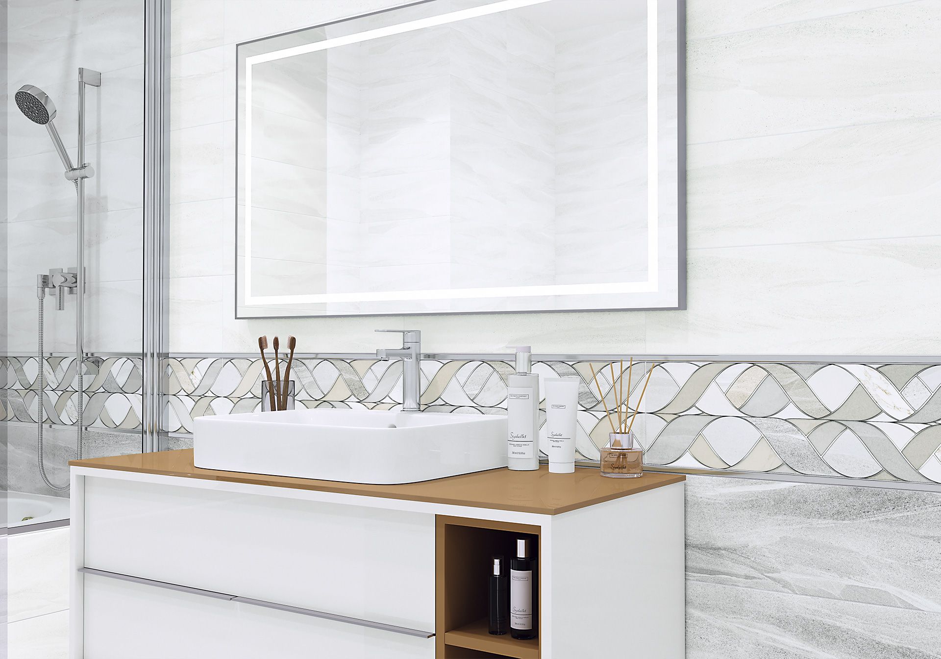 Коллекция Slate rock (сланцевый камень) — это сочетание яркого, выразительного декора с текстурой горной породы. Матовая поверхность как нельзя лучше передает фактуру натурального сланца, а декоративные элементы подчеркнуты сверкающими материалами. Коллекция представлена в двух колористиках: пепельно-стальная и песочно-золотистая. Декор для холодных баз представляет собой тонкие элегантные спирали, символизирующие воздушные потоки высоко в горах. Декор для песочных баз многослойный и геометричный, декоративные материалы подобраны специально для того, чтобы усилить иллюзию объема.