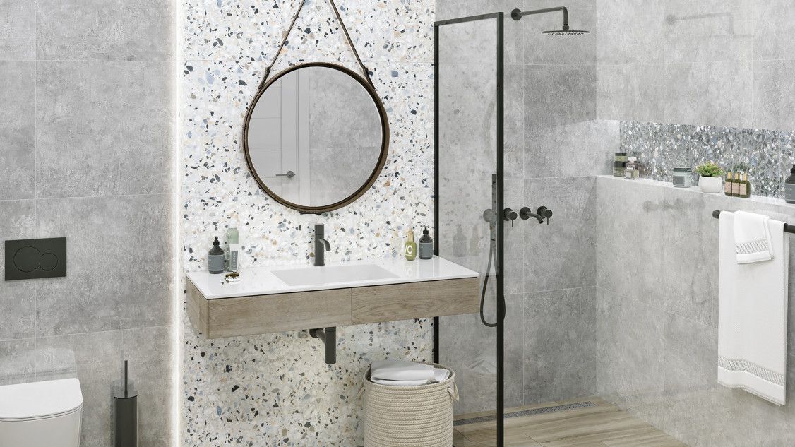 Этот керамогранит с лаппатированной поверхностью — воплощение итальянского терраццо. Представляет собой кусочки камня, мрамора и стекла, залитые в единое полотно цементом. Также его часто называют мозаичным полом. Рисунок из каменной крошки делает поверхность визуально более объемной, а дизайн - современным.