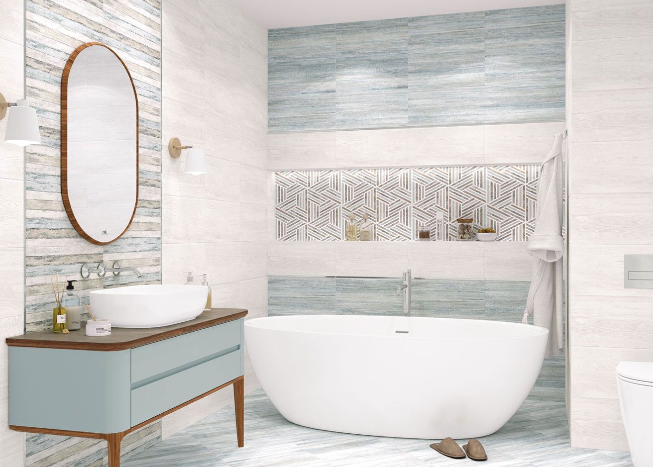 Уно / Uno от Alma Ceramica - коллекция керамической плитки для ванной комнаты, под дерево в светлых оттенках бежевого. Плитка имеет матовую, структурированную поверхность.