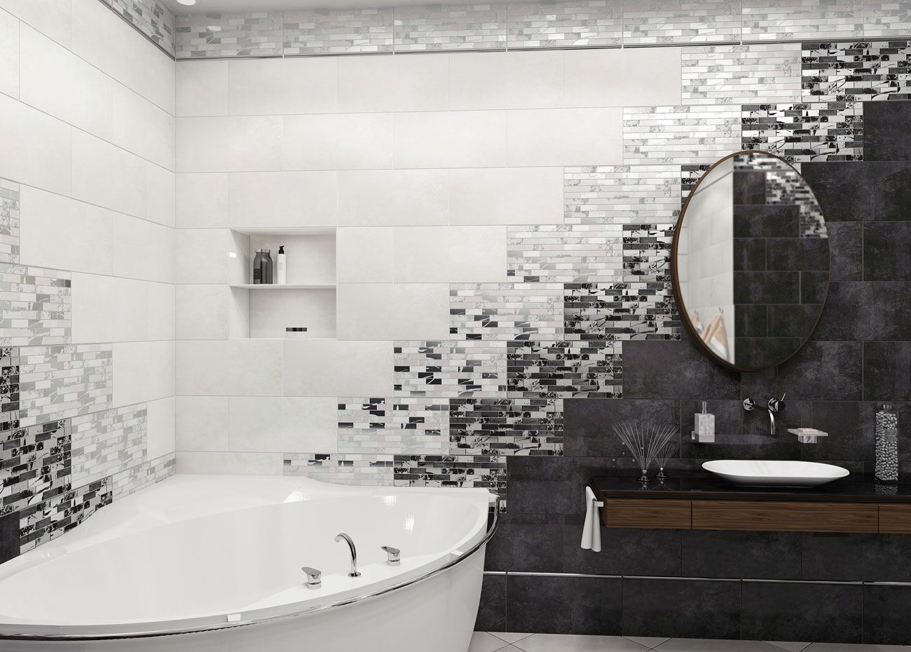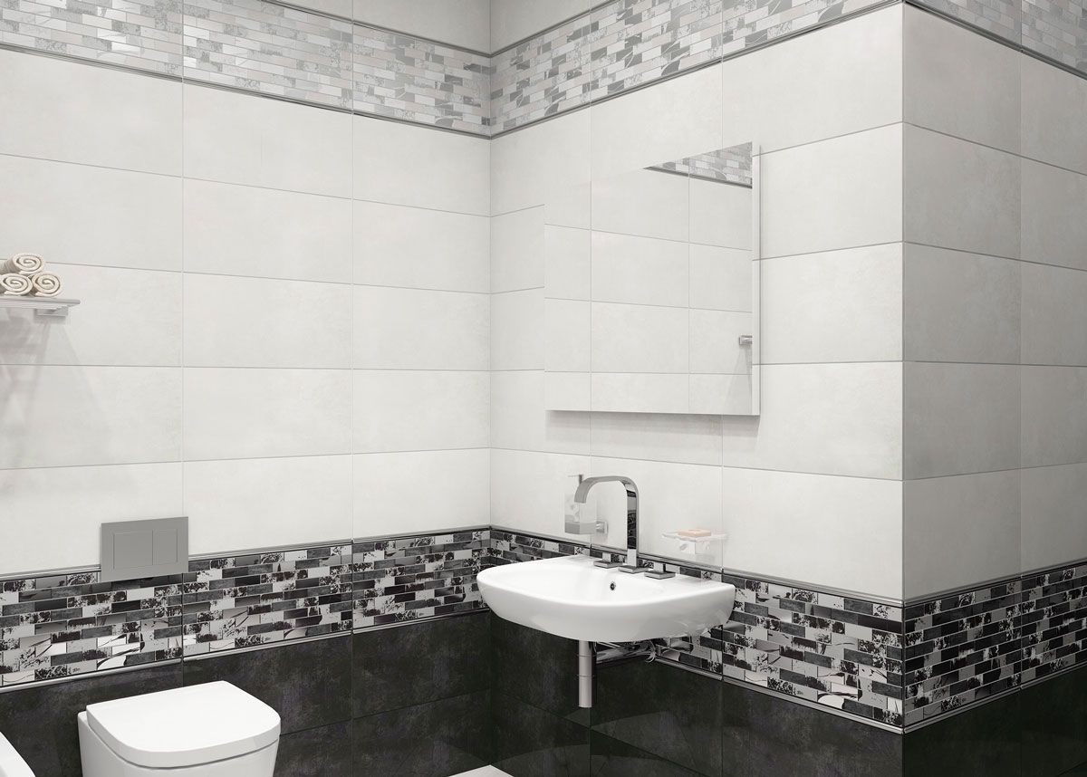 Glent от Altacera - коллекция керамической плитки для ванной комнаты в черно-белой и серой цветовой гамме. Коллекция Glent представлена в формате 249х500. Декоры выступают как выразительный акцент коллекции, выполненный в столь популярном стиле лофт. Они отличаются оригинальностью и станут ключевой деталью интерьера. С их помощью можно создать современный интерьер ванной комнаты с нотками индустриальности. Бордюр Sword и мозаика Silver Vesta гармонично дополняют декоративные элементы. Напольная плитка представлена в двух вариантах Antre Black и Antre White, что позволяет их комбинировать разнообразными способами. Плитка коллекции имеет полуглянцевую поверхность.