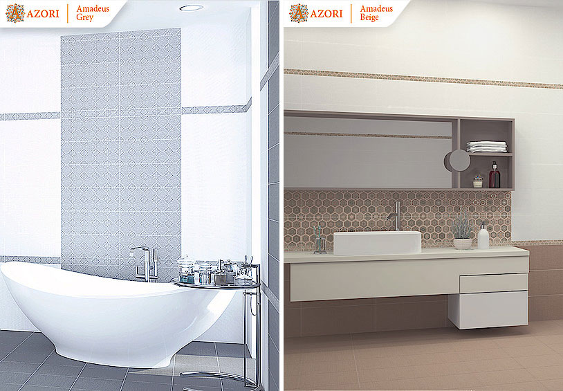 Амадеус / Amadeus (Beige, Grey) от Azori - коллекция керамической плитки для ванной комнаты. Глянцевая фактура коллекции с лёгкой графикой тканевого плетения вкупе с классическим жемчужным орнаментом декора напоминает блеск дорогих камней, чеканку на серебре. Выполнена в двух цветовых решениях – карамельно-бежевом и сером цвете. Элементы коллекции сочетаются в различных комбинациях, образуя оригинальные композиции. Второй декоративный элемент – ультрамодный гексагон с мягким, утонченным рельефом.