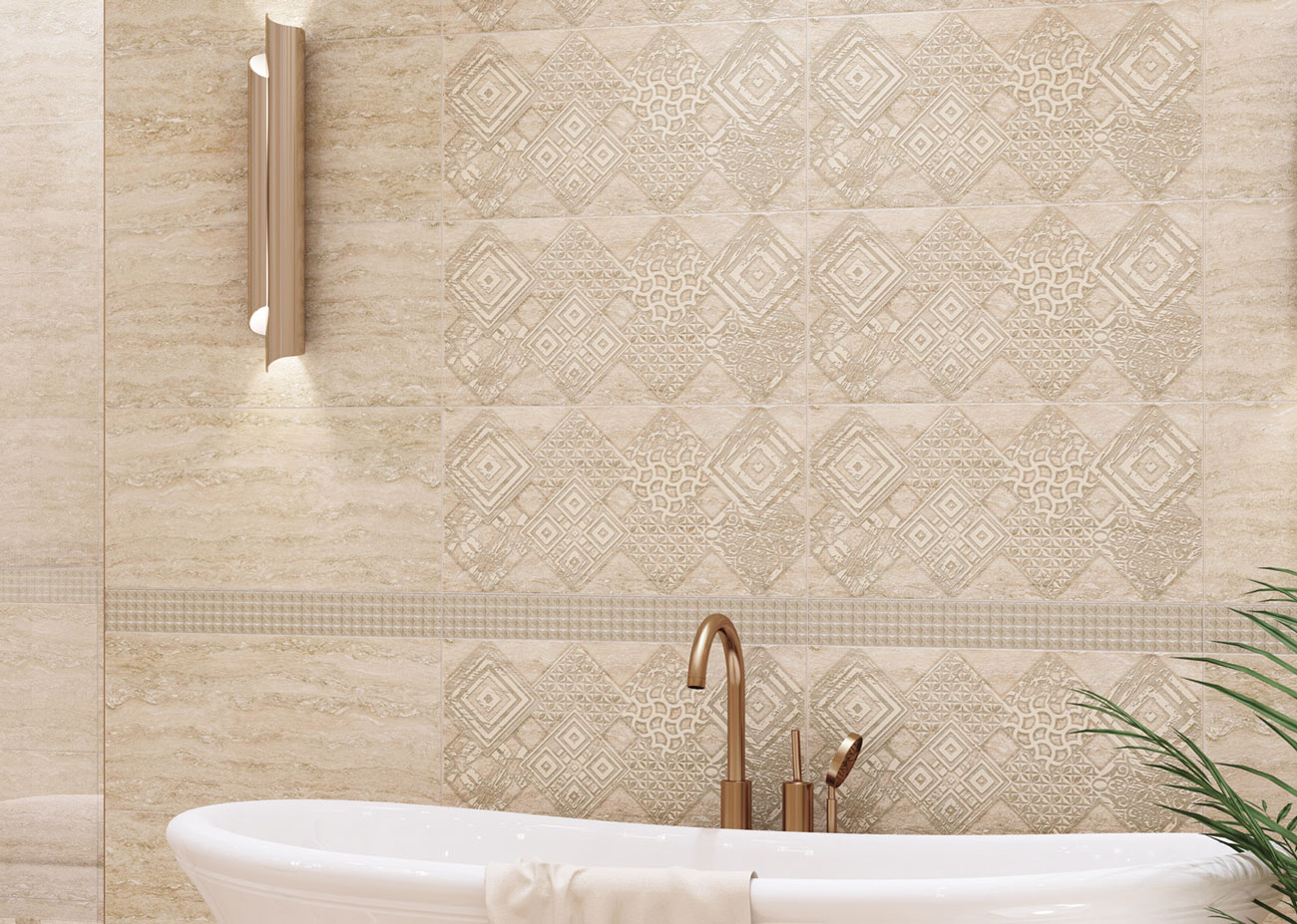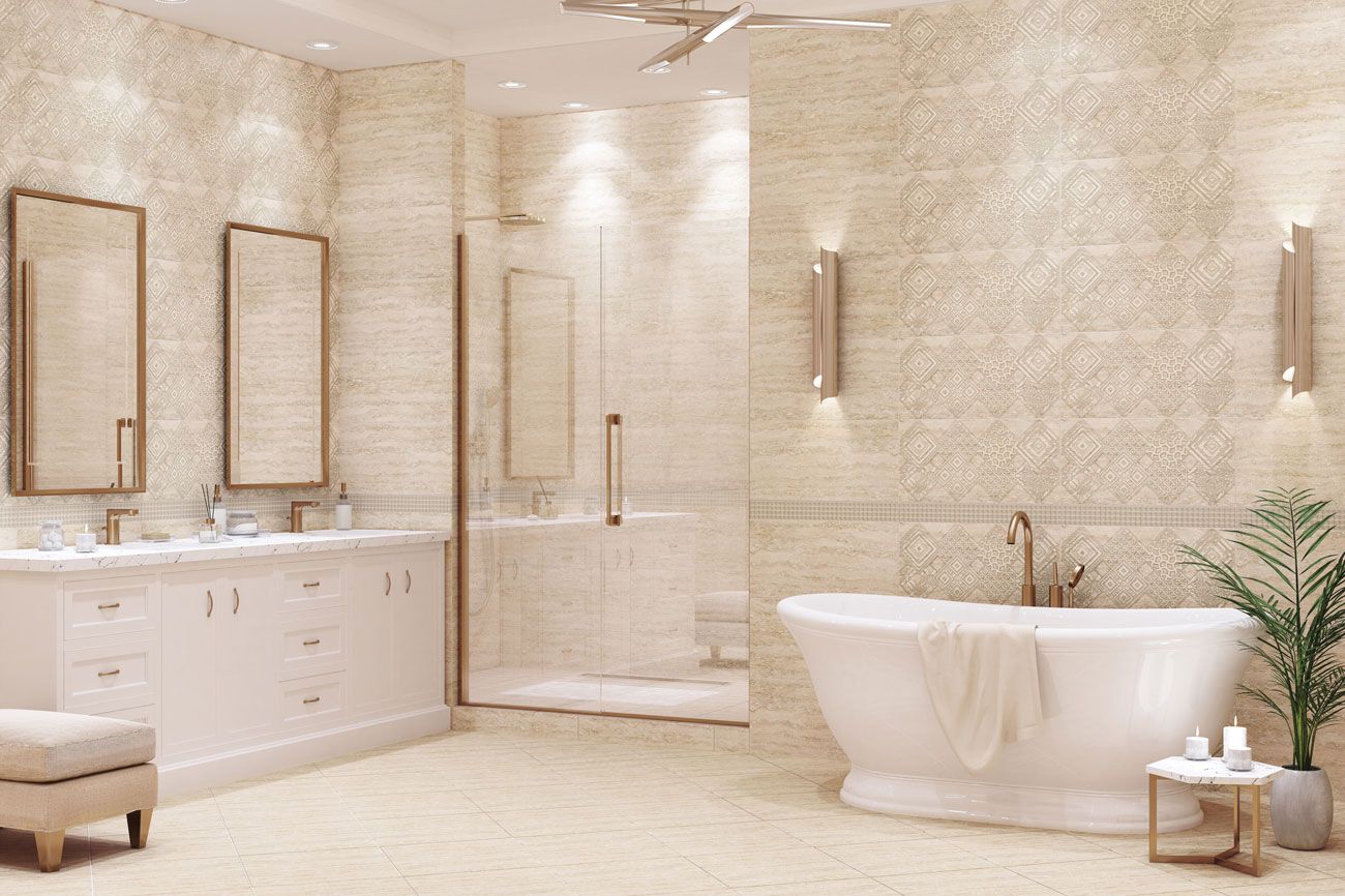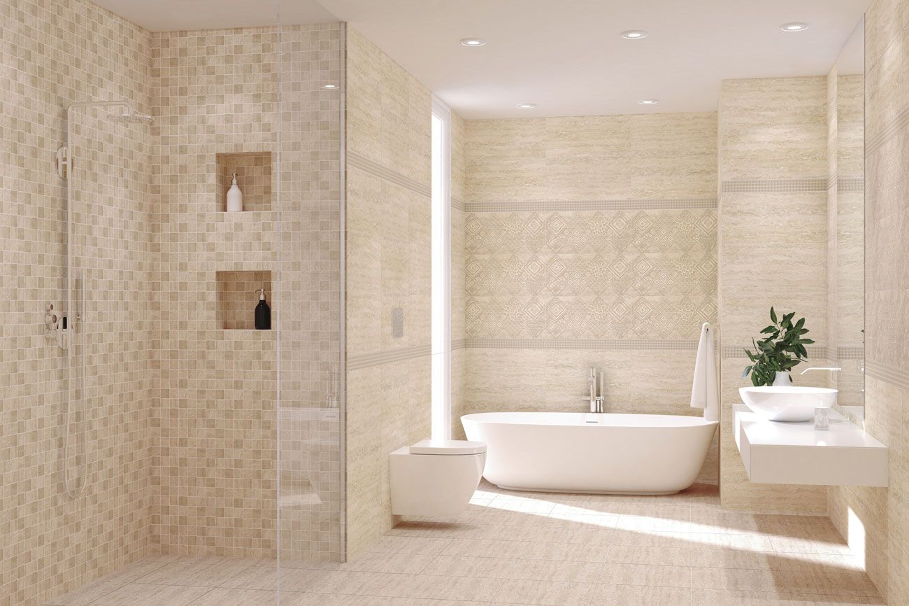 Асколи / Ascoli от Azori - коллекция керамической плитки для ванной комнаты под бежевый камень травертин. Название коллекции отсылает к итальянскому городу Ascoli Picero, который почти весь выстроен травертином. Два цветовых решения предполагают реализацию интерьера в двух гармониях: тёплой Ascoli Beige и холодной Ascoli Grey, а сатинированная глазурь добавляет мягкого свечения. Декор Classico позволяет элегантно обогатить дизайн ванной комнаты золотыми / серебряными ветрозами и металликами; в тоже время декор Geometria придаёт интерьеру современные нотки - шиммеринг, металлик и матовая ветроза создают объём растительного орнамента, формируя ромбообразную композицию. Представлена и мозаика с размером листа 30х30 см с ячейками 4,8 см. Сочетание плитки с мозаикой в ванной комнате может полностью изменить интерьер помещения, придав ему более дорогой вид. Плитка коллекции имеет гладкую, матовую поверхность.