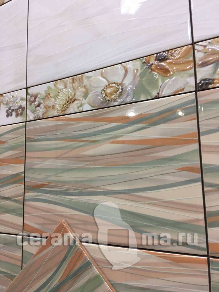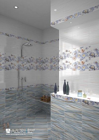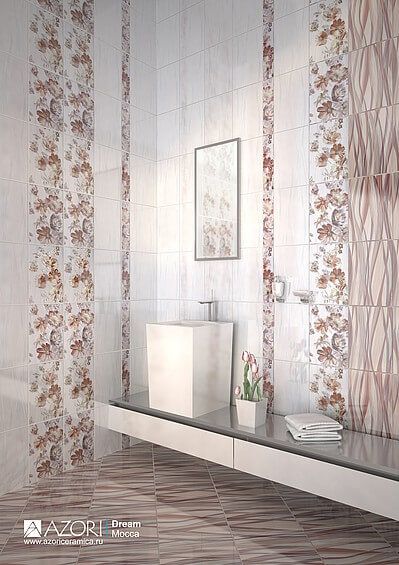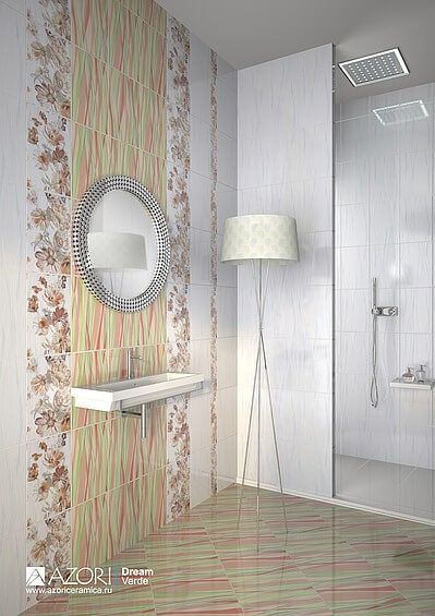 Dream / Дрим от Azori - коллекция керамической плитки для ванной комнаты, которая представленна в трёх оттенках: Verde (верде, зелёный), Mocca (Мокка, коричневый), Blue (Блю, синий, голубой). Коллекция Dream представляет новый формат плитки "AZORI" 20х30. Фактура плиты для стен динамична и похожа на находящие друг на друга волны, которые выполнены в разных цветовых оттенках: зеленом, оранжевом и бежевом. Сочетание этих оттенков придает коллекции свежесть и неповторимость. Не случайно коллекция с такой фактурой названа DREAM, что в переводе с английского означает МЕЧТА. Изюминка коллекции - панно Floret, состоящее из двух декоров, выполненное в цветочном стиле. Узор цветов на панно также повторяет движение волны, заданное нижней темной плитой для стен. Коллекция может выкладываться на стену как в горизонтальном положении, так и в вертикальном. Традиционный размер и оригинальный дизайн, сочетающий в себе современные тенденции керамической отрасли заставят посмотреть на дизайн ванной комнаты новым взглядом. Настенная плитка Dream имеет глянцевую поверхность.