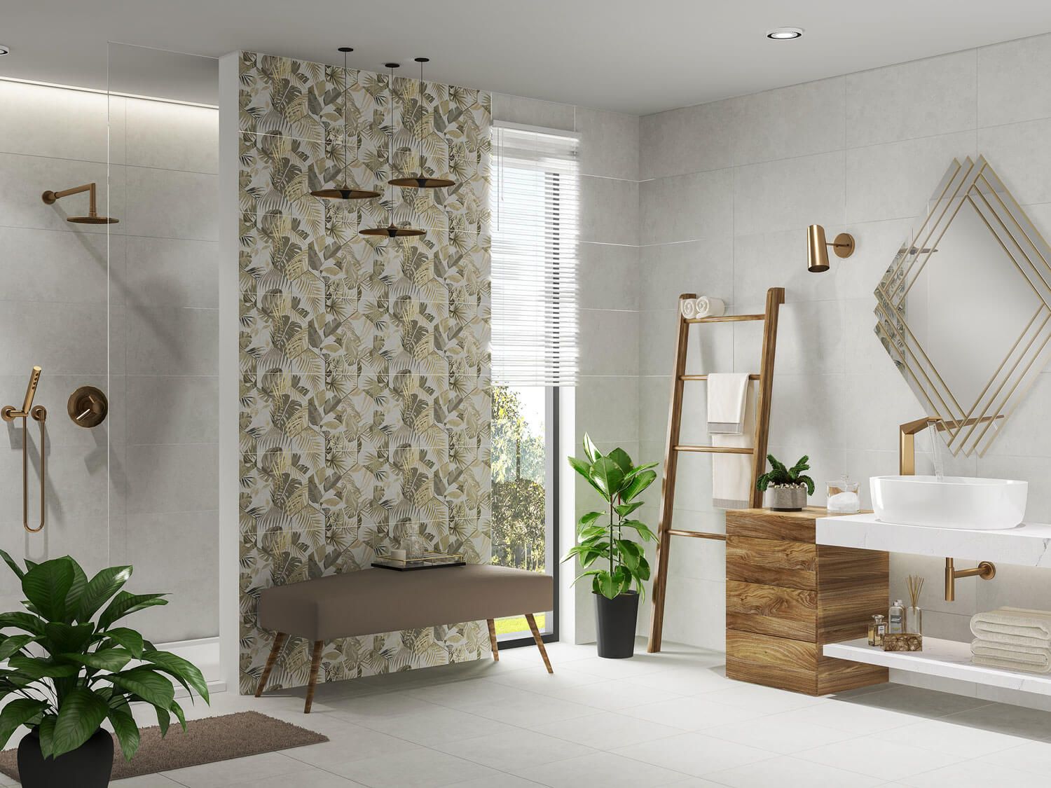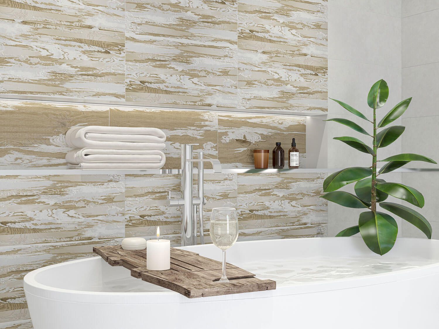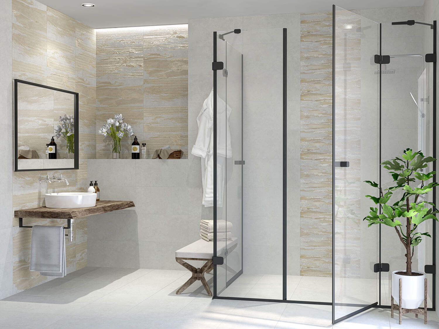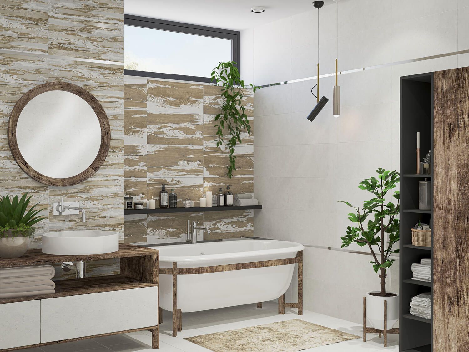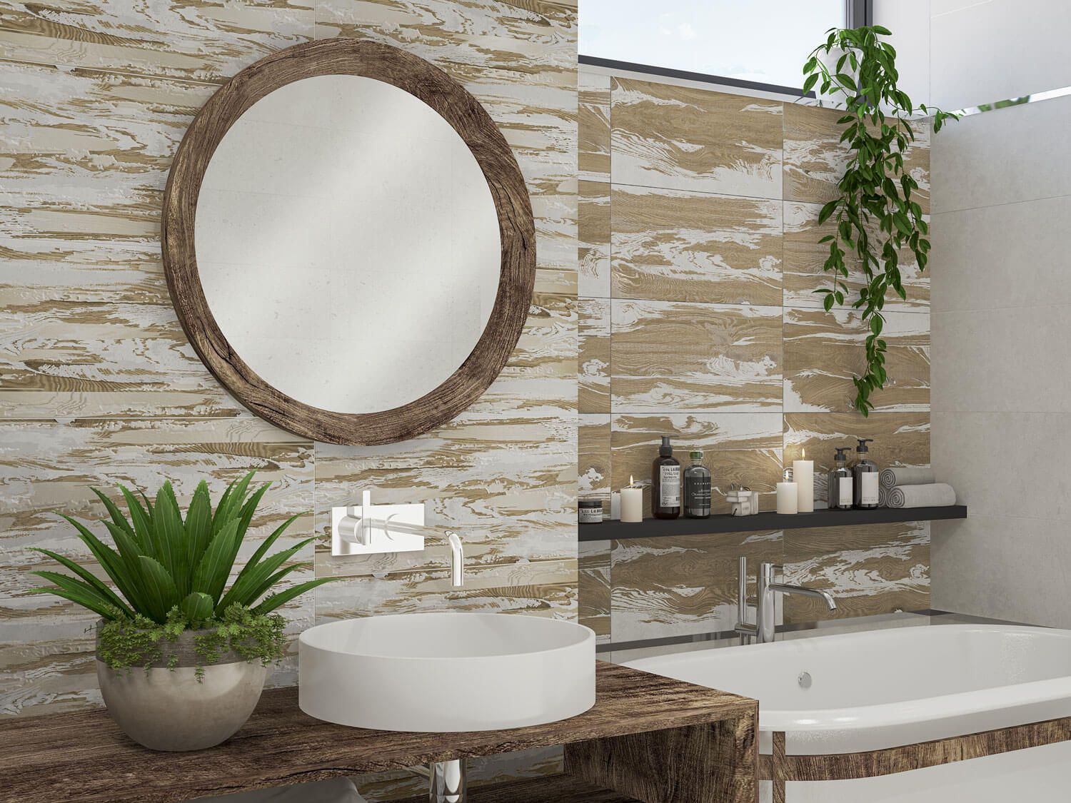 Базовой плитой коллекции является дизайн бетона, графика которого подчёркнута сахарозой, создаётся эффект матового блеска. Две темные плиты или плиты-компаньоны это микс бетона со встроенными деревянными полотнами в светлом и темном оттенке, кольца которых декорированы сахарозой. Декоративный элемент - это инкрустация по дереву, созданная ветрозой и металликом.