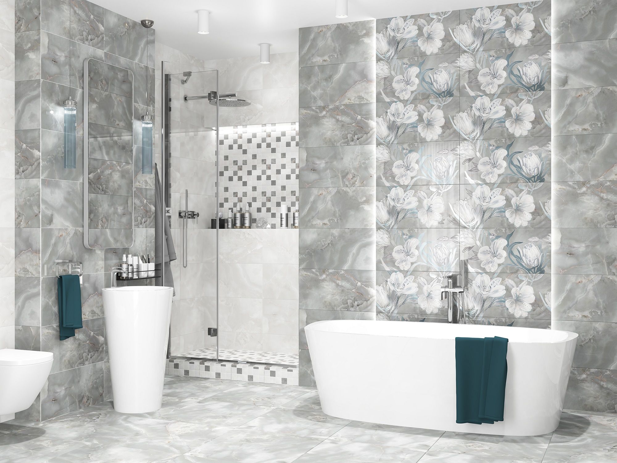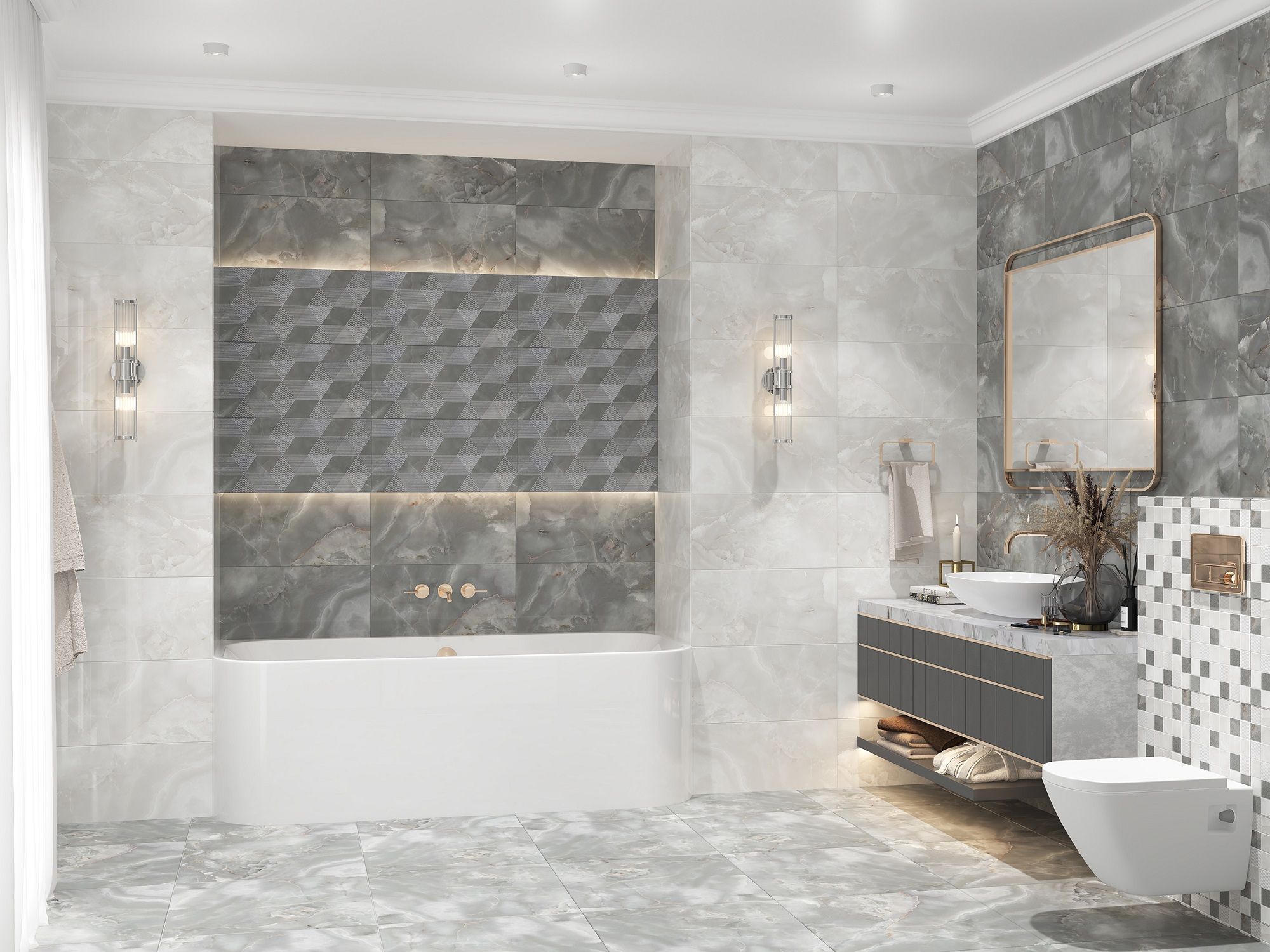 Цветовые решения коллекции реализованы в двух направлениях. Глубокий, графитовый GREY - самодостаточный и благородный, создающий бархатную текстуру с 6-ю фрагментами в полотне, прекрасная база для создания роскошного интерьера как в моно цвете, так и используя светлую плиту Light.