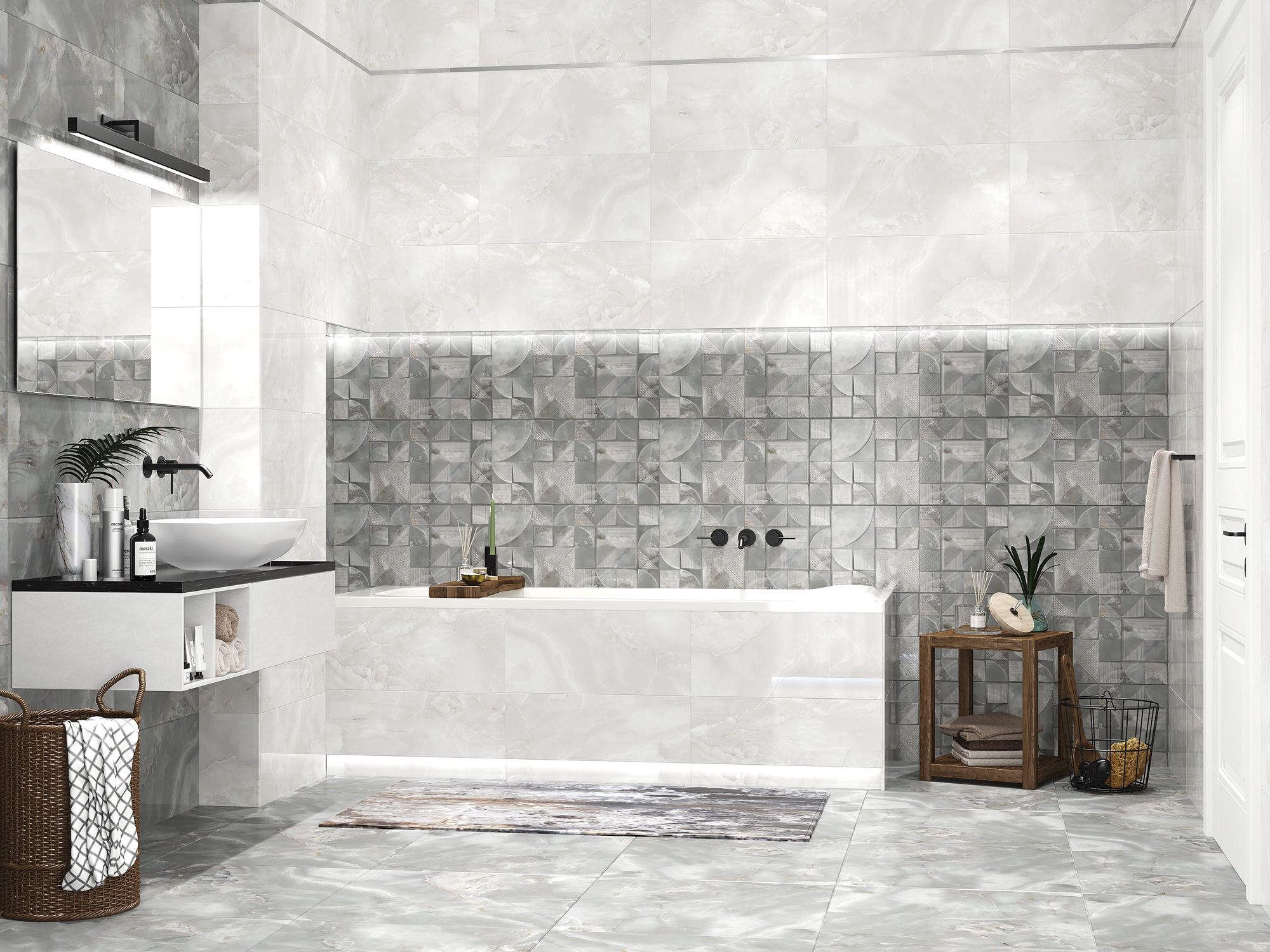 Коллекция дополнена структурной плитой и мозаикой, что позволяет удачно зонировать пространство, керамогранит 600х600 мм является заключительным элементом интерьера.
