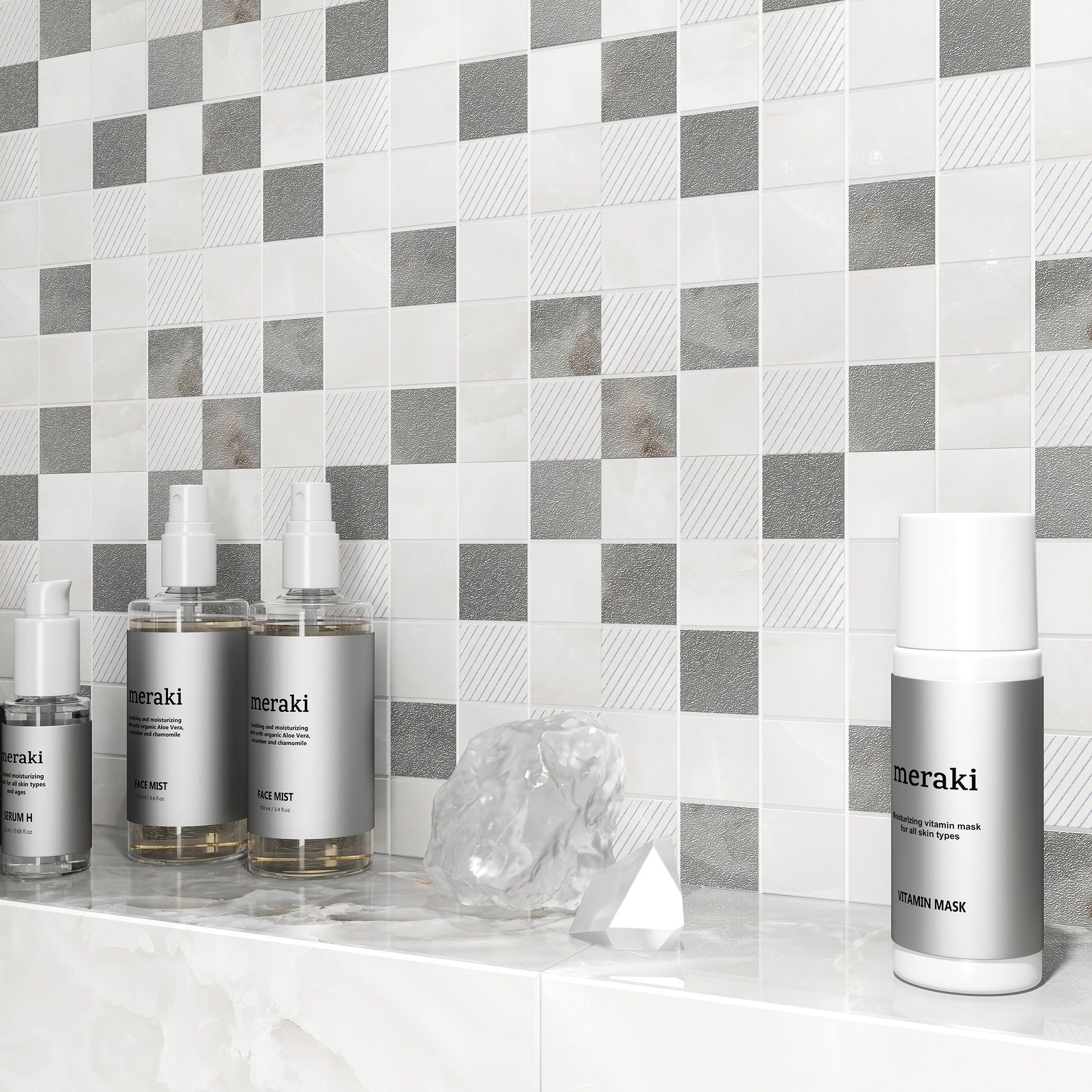 Акцентным элементом является декор Geometria, украшенный шиммерингом и люстром с эффектом глиттера. Мягкий переливчатый блеск люстра в сочетании с контрастными линиями шиммеринга привнесут в ваш интерьер стиль модерн.