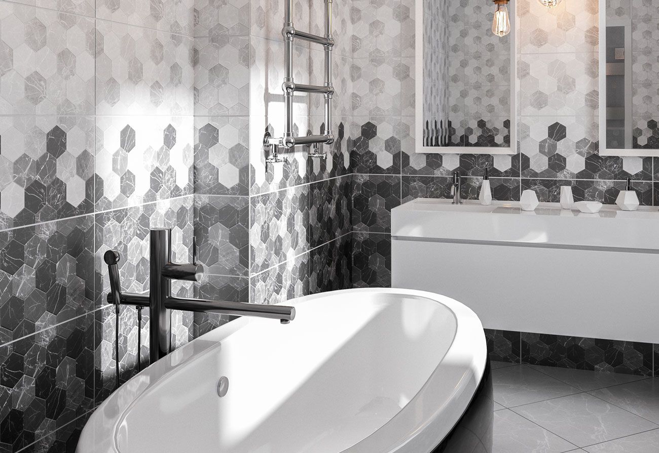 Дайкири от Belani (Беларусь) - коллекция керамической плитки для ванной комнаты под камень, имитирует кладку шестиугольной плиткой (соты). Настенная плитка имеет глянцевую поверхность.