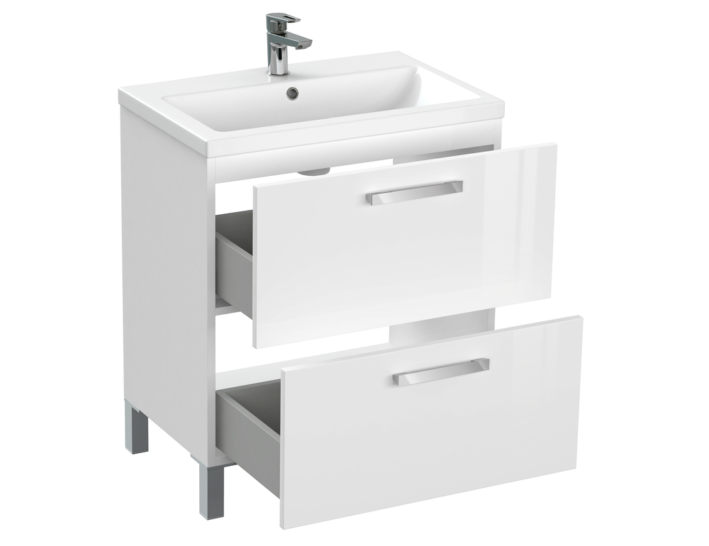 Тумба под раковину MELAR выполнена в нетеряющем актуальности белом цвете. Гладкие глянцевые фасады ящиков дополены хромированными ручками четкой геометричесокй формы. Скрытые направляющие ящиков снабжены доводчиками, что позволяет закрывать ящик мягко и бесшумно. Тумбу можно как подвешивать на стенку, так и устанавливать на ножки, что делает ее универсальным и функциональным решением для любой ванной комнаты.