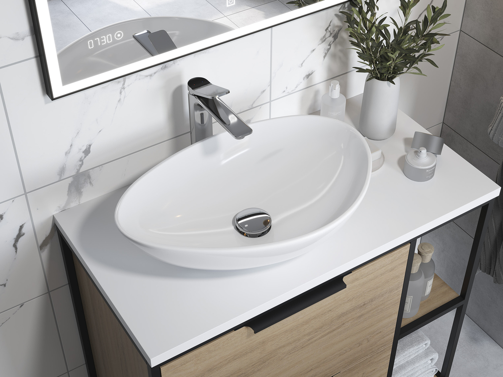 MODUO 55 LEAF — асимметричная раковина, которую можно устанавливать на столешницу любой стороной. Дизайнерское решение для нестандартных интерьеров, в которых главное — необычные идеи и неожиданный подход к воплощению задумки. размер раковины 55 см