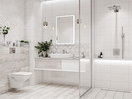Имитирующая нежный бежевый мрамор базовая плитка дополнена декором «листья» с 3D-текстурой. Декоры стыкуются во все стороны, позволяя выкладывать панно и выделять функциональные зоны. Динамичная рельефная база эффектно сочетается с золотистым матовым бордюром. Органичным дополнением природного настроения интерьера станет керамогранит PATINAWOOD в формате «деревянной доски» 18х60.