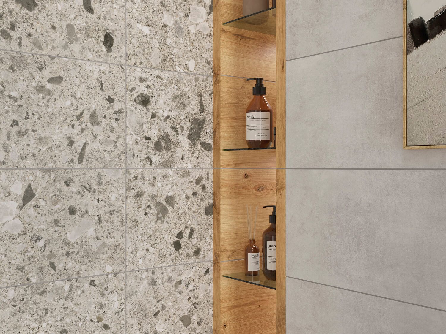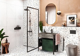 BROOKLYN MIX объединил в текстуры глянца, бетона, металла, тераццо и дерева. Элементы композиции идеально подходят друг другу по цвету, насыщенности и текстуре. Консультация дизайнера не потребуется. Реалистичный рисунок позволяет создать естественные функциональные зоны и расставить акценты. Металлический бордюр деликатно, но эффектно дополняет союз дерева и бетона. Серый керамогранит SPACE формата 30х60, имитирующий терраццо, внесёт в интерьер динамику. Коричневый WOODHOUSE идентичного формата благодаря «древесной» текстуре придаст спокойствия.
