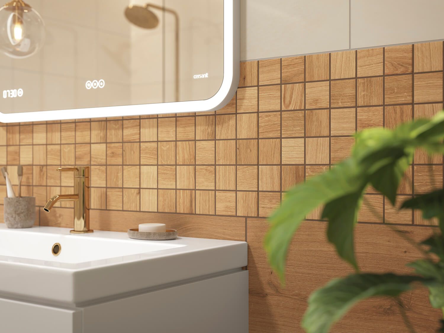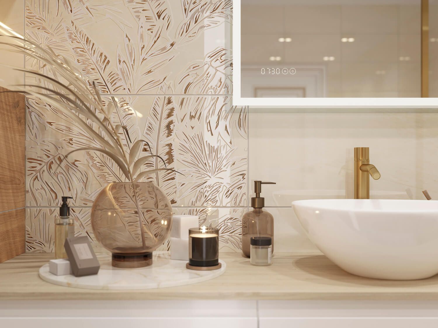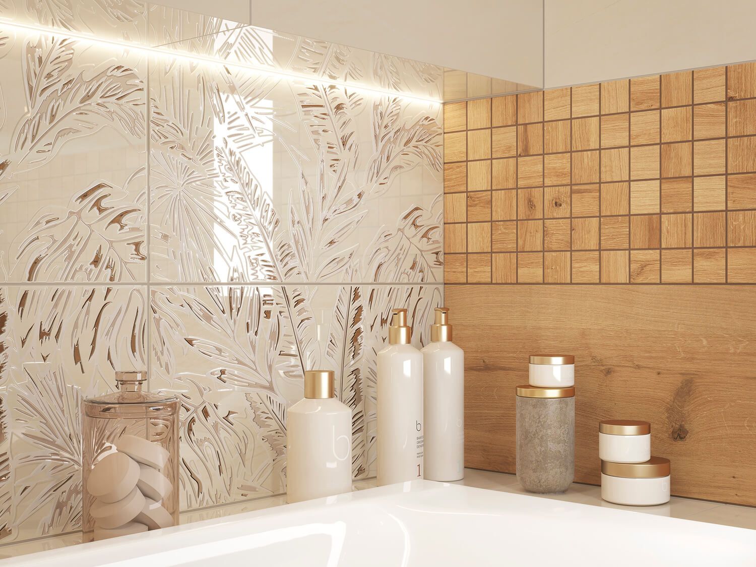 EFFECTA JUNGLE – квинтэссенция натуральности как глобального тренда в дизайне. Панно с растительным рисунком выглядит респектабельно за счёт гранили, золота и двух видов люстра. Деревянная текстура керамогранита 30х60 и квадратной мозаики – естественное продолжение природных мотивов. Эффект браширования золотого металлического бордюра перекликается с волокнистой структурой «деревянной» плитки. Все элементы в гармонии, как в первозданной природе.
