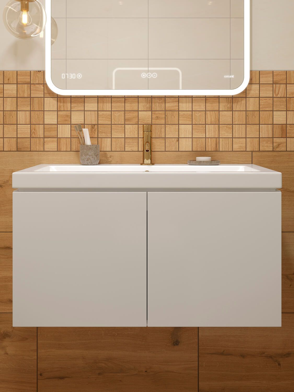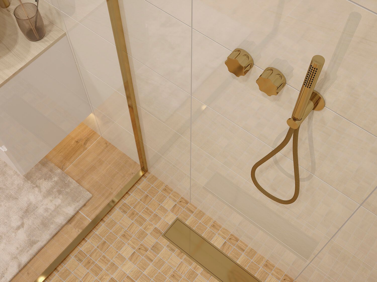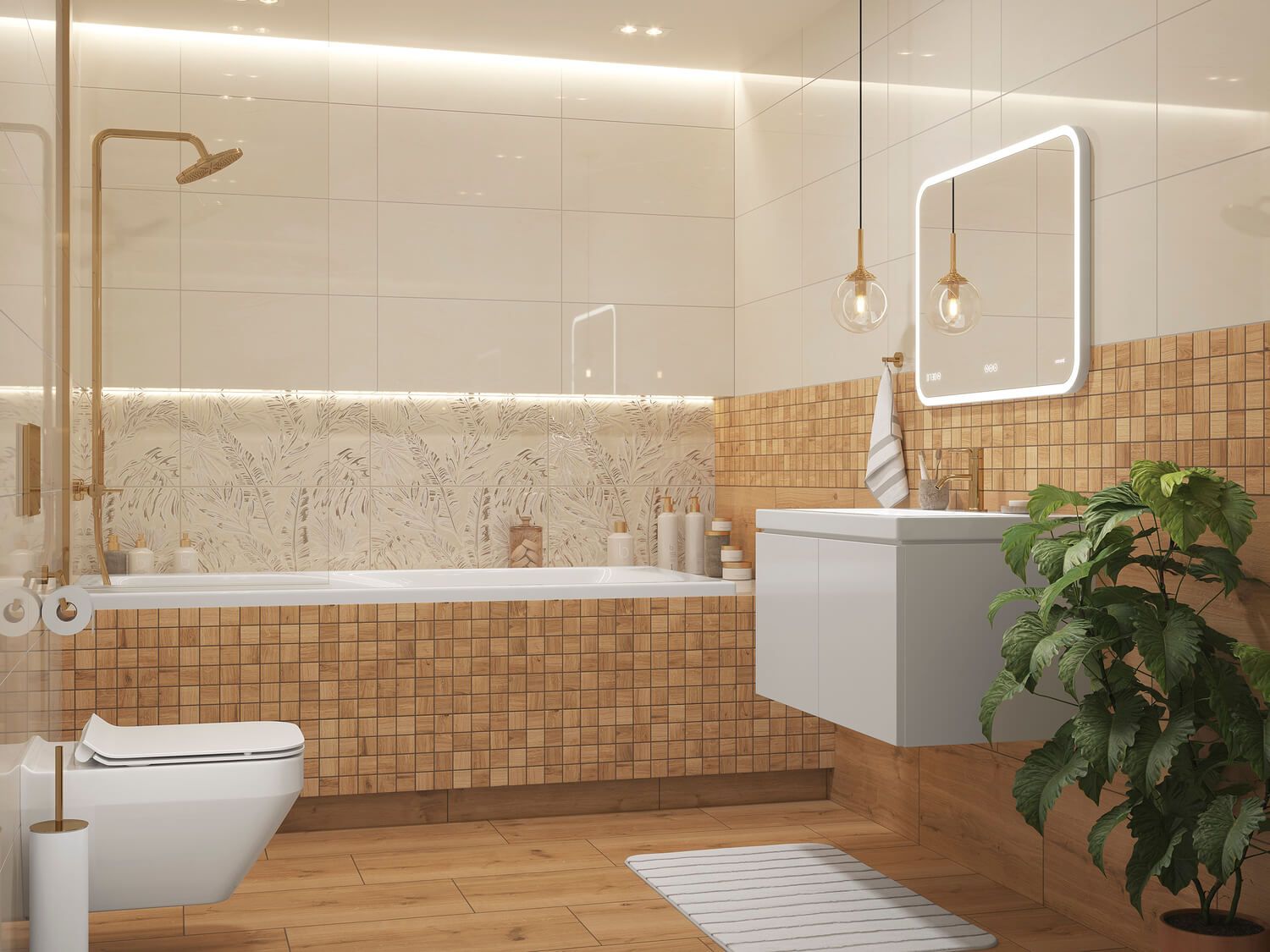 EFFECTA JUNGLE – квинтэссенция натуральности как глобального тренда в дизайне. Панно с растительным рисунком выглядит респектабельно за счёт гранили, золота и двух видов люстра. Деревянная текстура керамогранита 30х60 и квадратной мозаики – естественное продолжение природных мотивов. Эффект браширования золотого металлического бордюра перекликается с волокнистой структурой «деревянной» плитки. Все элементы в гармонии, как в первозданной природе.
