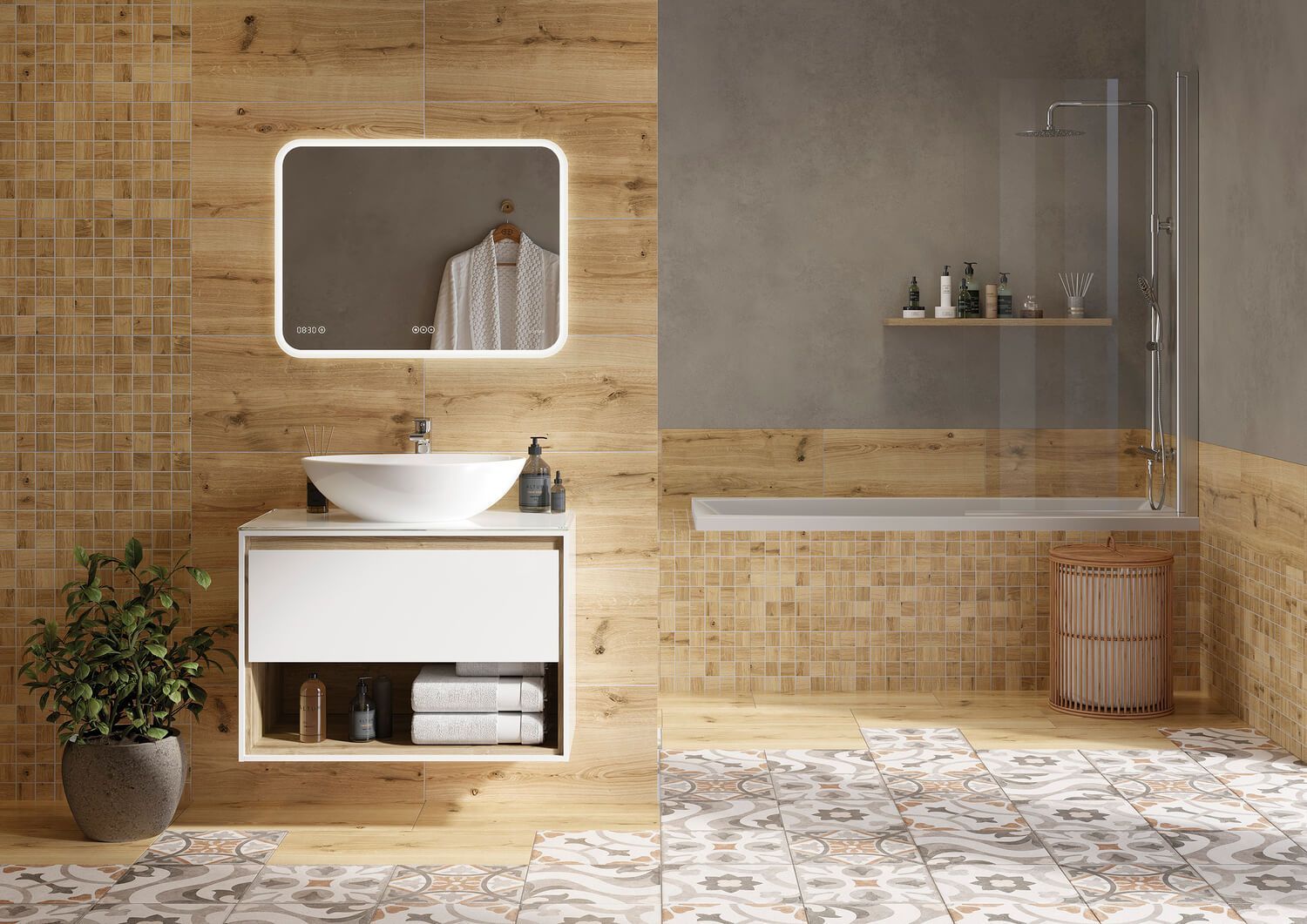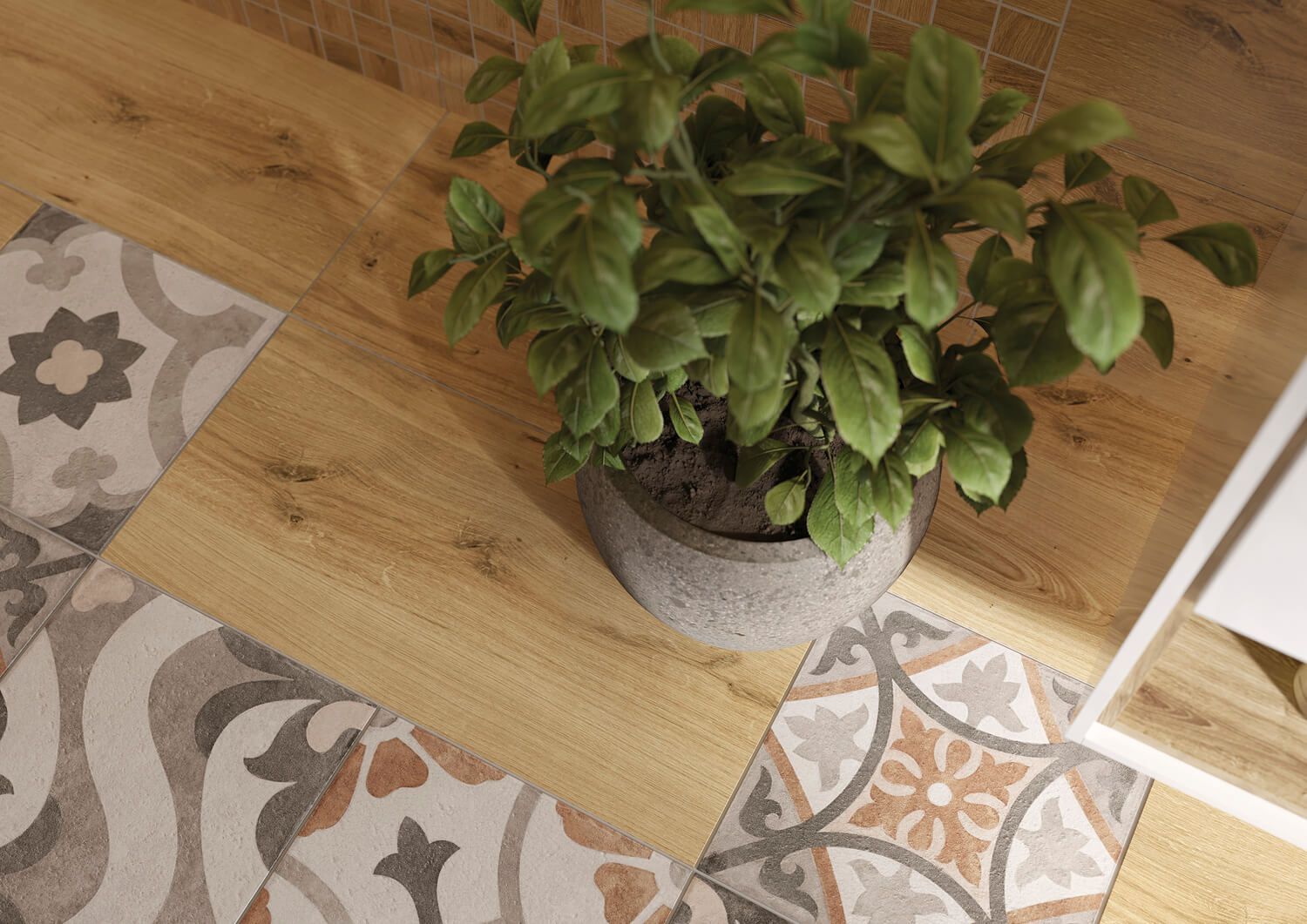 Дизайнерское сочетание текстур бетона и дерева с натуральной цветовой гаммой, заключённое в прямоугольные и квадратные плитки. Мозаика WOODHOUSE перекликается с керамогранитом CARPET в стиле пэчворк и LOFTHOUSE в тёплых серо-коричневых оттенках. Контрастный рисунок и благородные древесные мотивы добавят уюта, бетонные штрихи — брутальности, что обеспечит эффективное зонирование пространства и поможет создать разные по характеру интерьеры. Все элементы микса – это керамогранит, который сочетается между собой и подходит для отделки стен и пола.