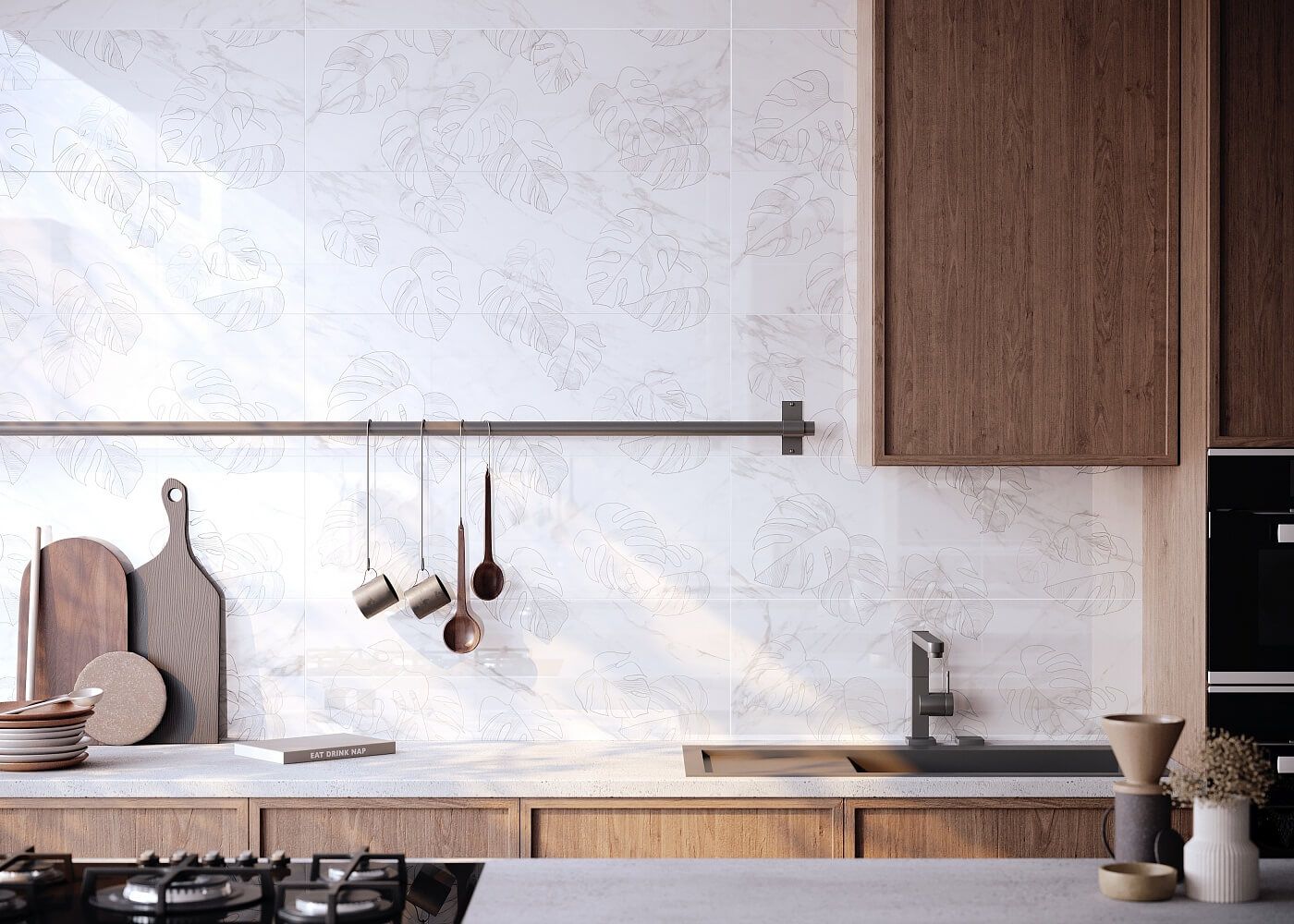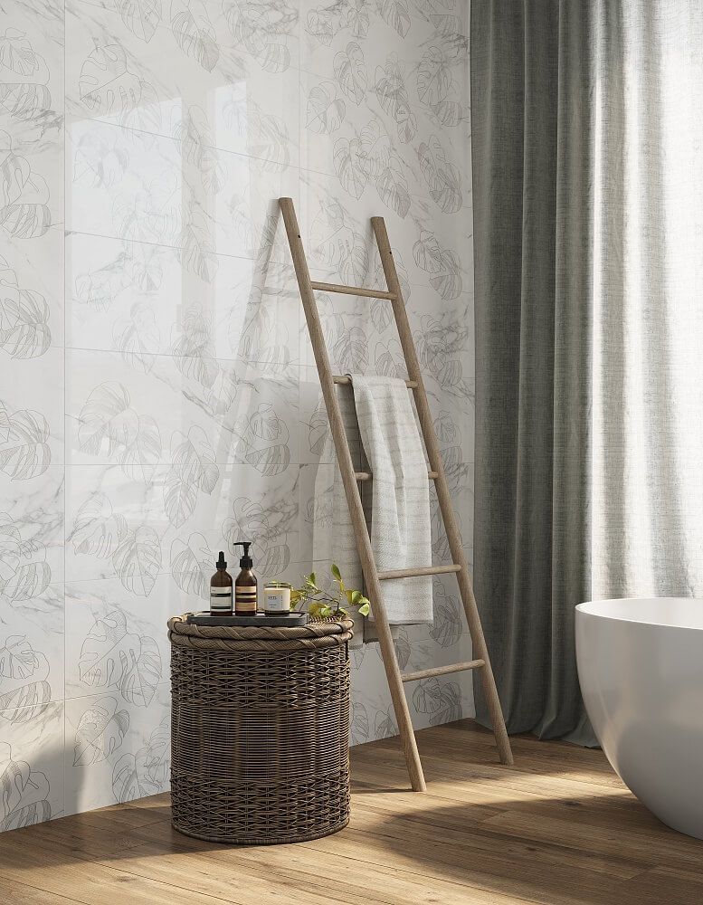 Коллекция плитки с текстурой благородного натурального мрамора — это идеальная база и основа для воплощения самых интересных экспериментов. Благодаря крупному формату 30х90 см и характерной глянцевой фактуре она создает эффект настоящего мрамора и может использоваться для отделки стен и фартуков. Помимо плитки с гладкой фактурой и базовой текстурой белого мрамора в коллекции представлен живописный декор с контурным растительным узором, который идеально подходит для создания интересных акцентов.