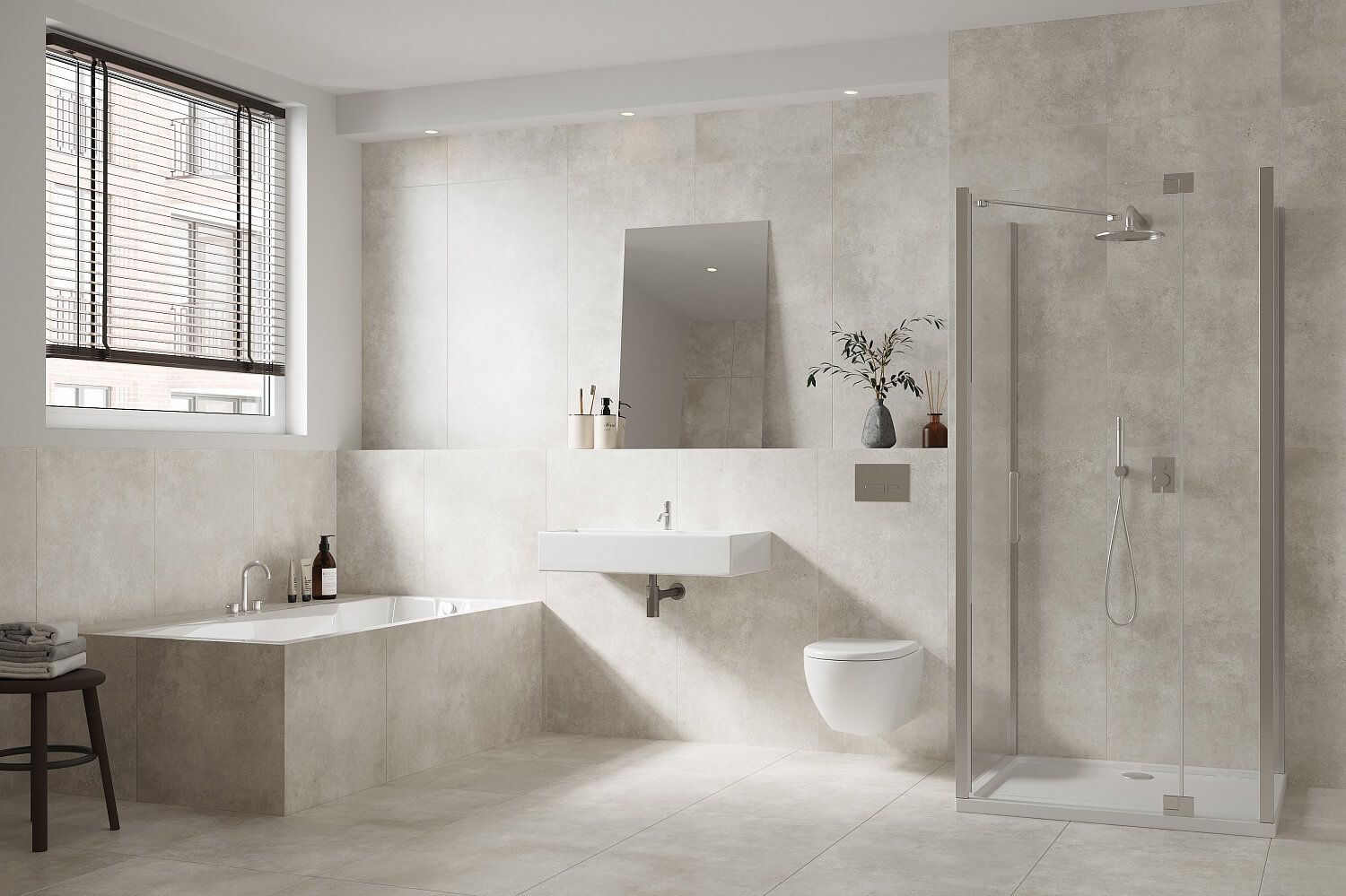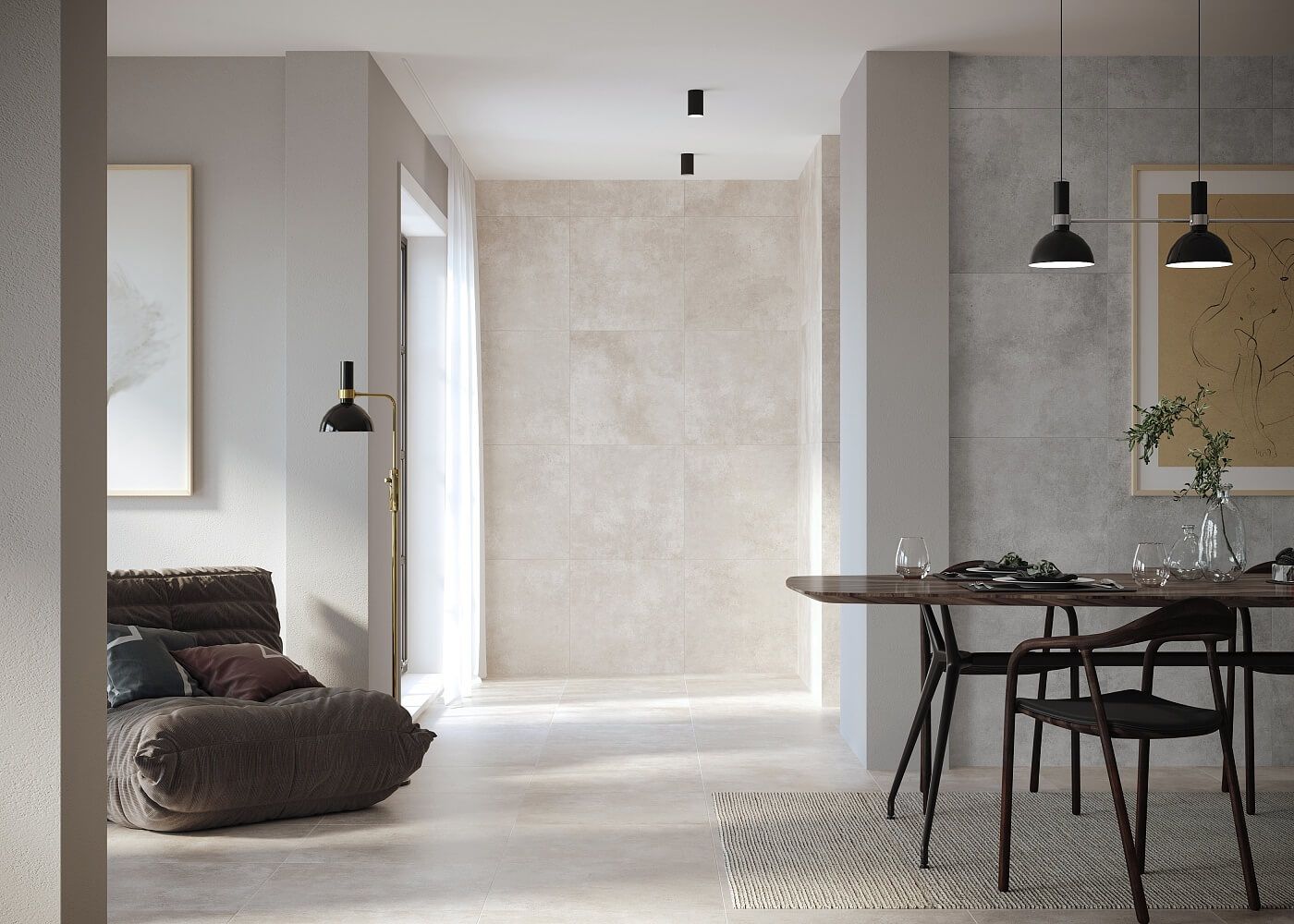 Керамогранит в двух базовых оттенках серого имитирует бетонную текстуру. Благодаря техническим характеристикам плиту можно использовать как на стенах, так и на полу. Плита представлена в двух крупных формата: 60х60 см и 120х60 см, что в совокупности с ректифицированным краем позволяет создать эффект монолитной поверхности с минимальным количеством швов.
