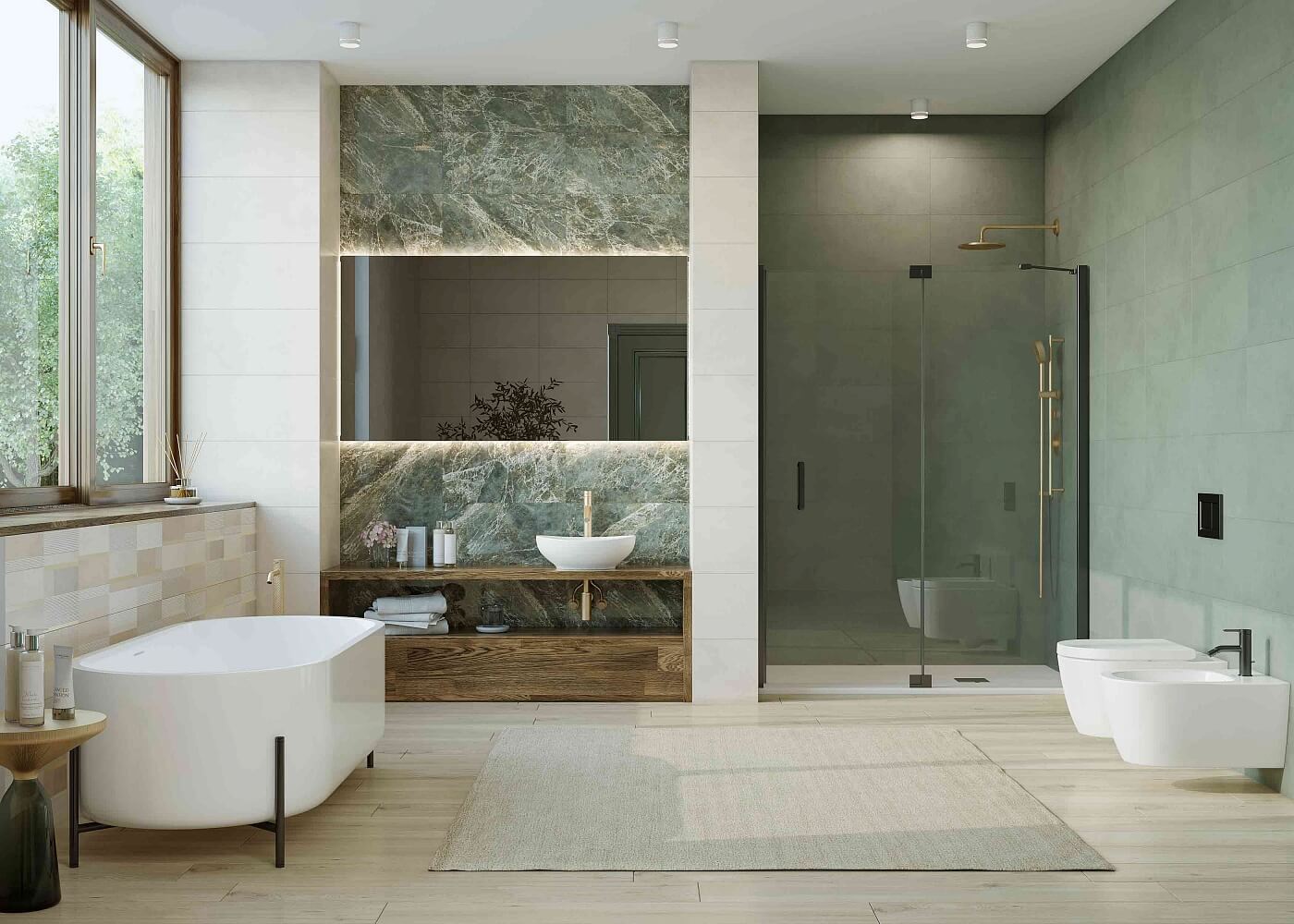Коллекция керамической плитки Payne — это яркое и интересное сочетание двух самых популярных сегодня текстур: бетона и камня. Для воплощения бетонной поверхности дизайнеры выбрали неожиданные бежевый и темно-зеленый оттенки, а особенно необычно смотрится редкая текстура под зеленый мрамор. Коллекцию дополняют два варианта декоративных вставок с геометрическим рисунком в основных оттенках коллекции.