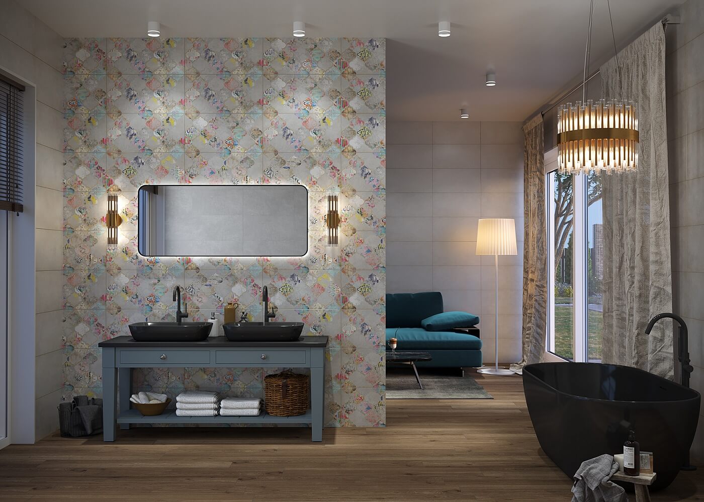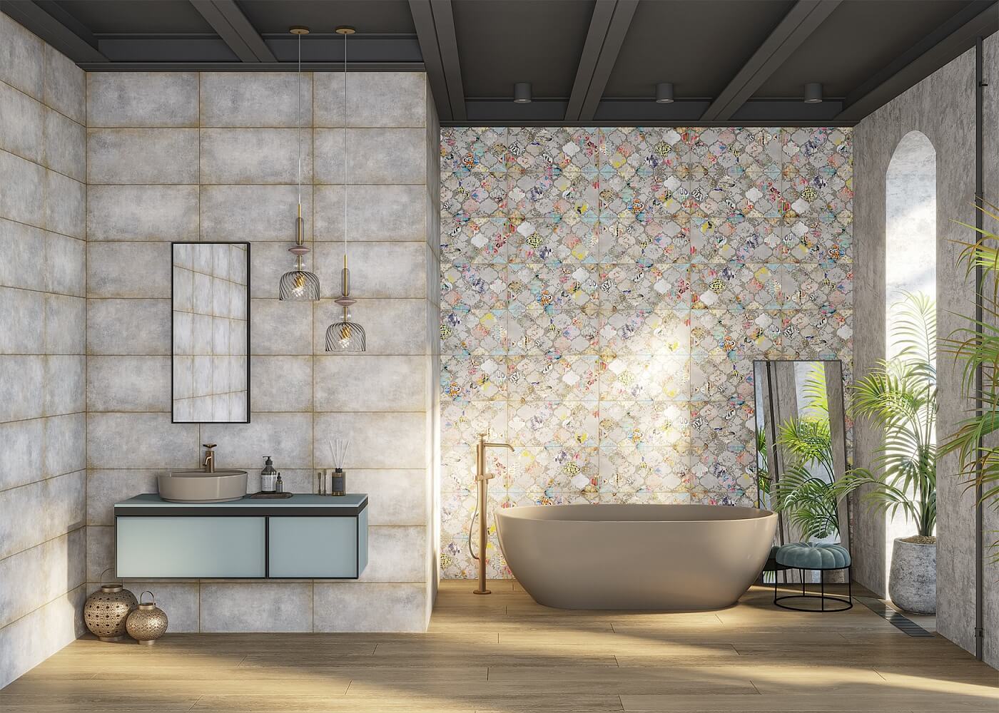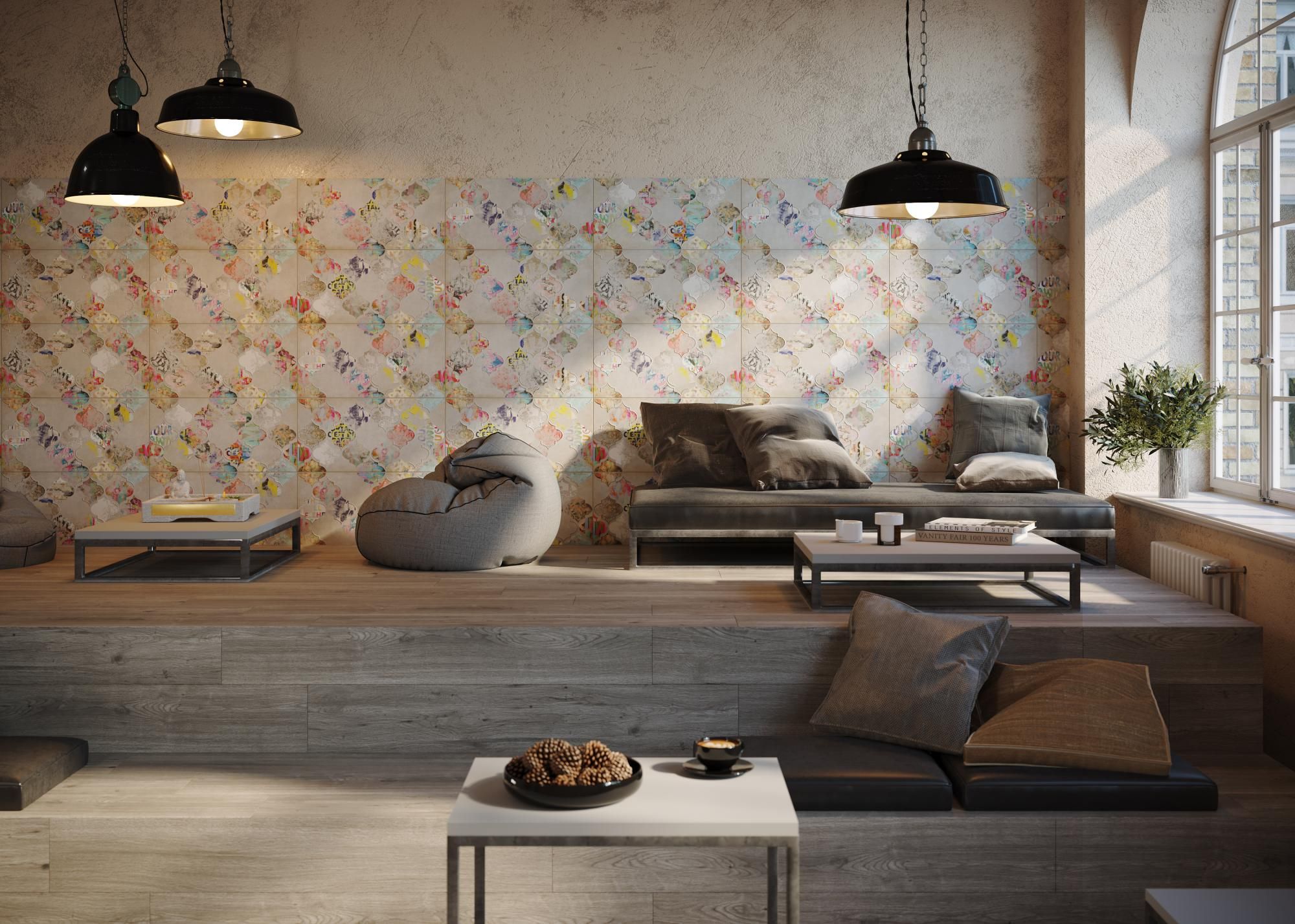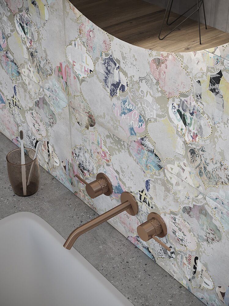 По орнаменту арабеска напоминает турецкие фонарики из цветного стекла и непременно переносит нас в красочную восточную сказку. Яркий декор легко использовать как самостоятельно, так и в сочетании со сдержанной основой коллекции — плиткой с текстурой бетона. Коллекция сочетается с винтажным декором, классическими элементами и эклектичным дизайном.