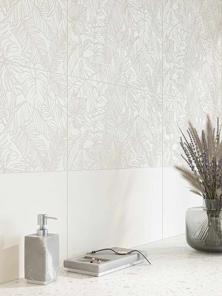 Базовая часть коллекции представлена несколькими вариантами плитки с текстурой камня и рисунком терраццо — яркой каменной крошки, которая продолжает производить фурор в самых разных стилях интерьера. Декоративная вставка представляет собой нежный флоральный рисунок с контурным изображением тропических листьев в нежно-розовом цвете.
