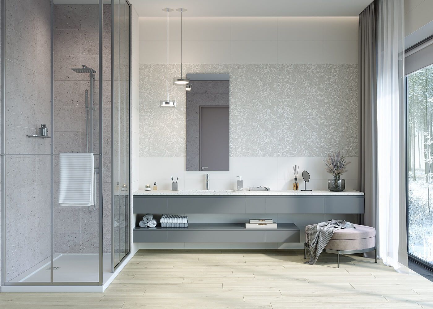 Пастельная гамма стала главной темой в коллекции. Идеально подходящие для отделки ванных комнат, пастельные серые, розовые, лиловые и голубые оттенки не перетягивают на себя слишком много внимания, отлично сочетаются с белым и серым фоном, а также взаимодействуют с другими актуальными сегодня текстурами: деревом, камнем, бетоном.