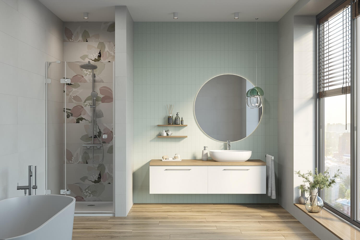 Коллекция настенной керамической плитки Vogue — это необычное сочетание брутальной текстуры серого бетона с флоральными мотивами, выполненными в гламурном розовом оттенке. Плитки под бетон дизайнеры предлагаю использовать в качестве основы и фона, а декоративную вставку с флоральным узором — в качестве красивого и оживляющего пространство акцента. Оба варианта имеют матовую фактуру, единый размер 30х90 см и ректифицированный край, благодаря чему можно создать монолитную поверхность с минимальными стыками.