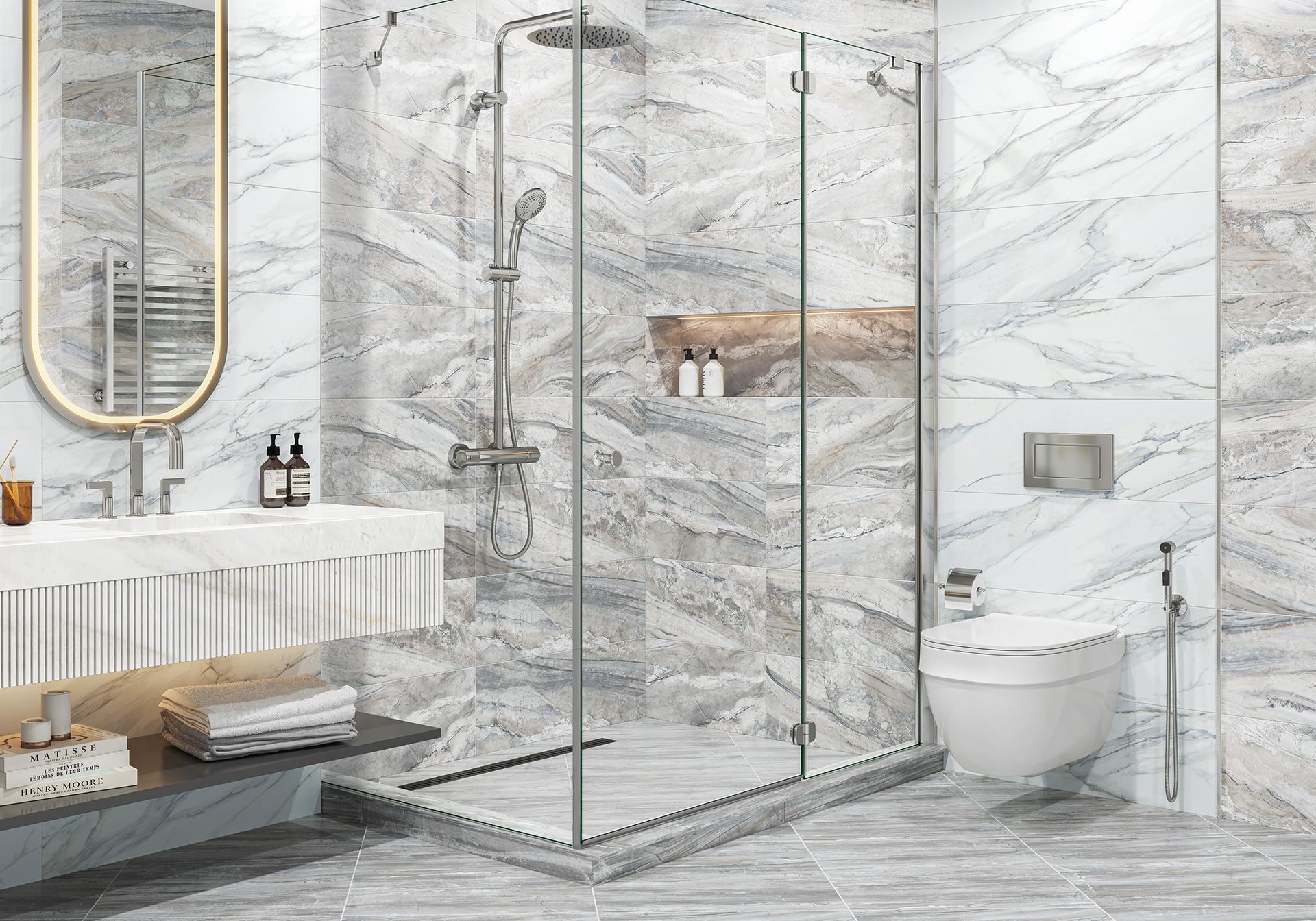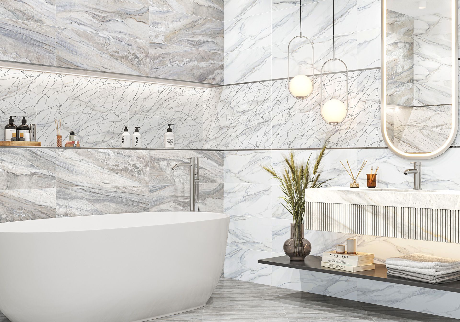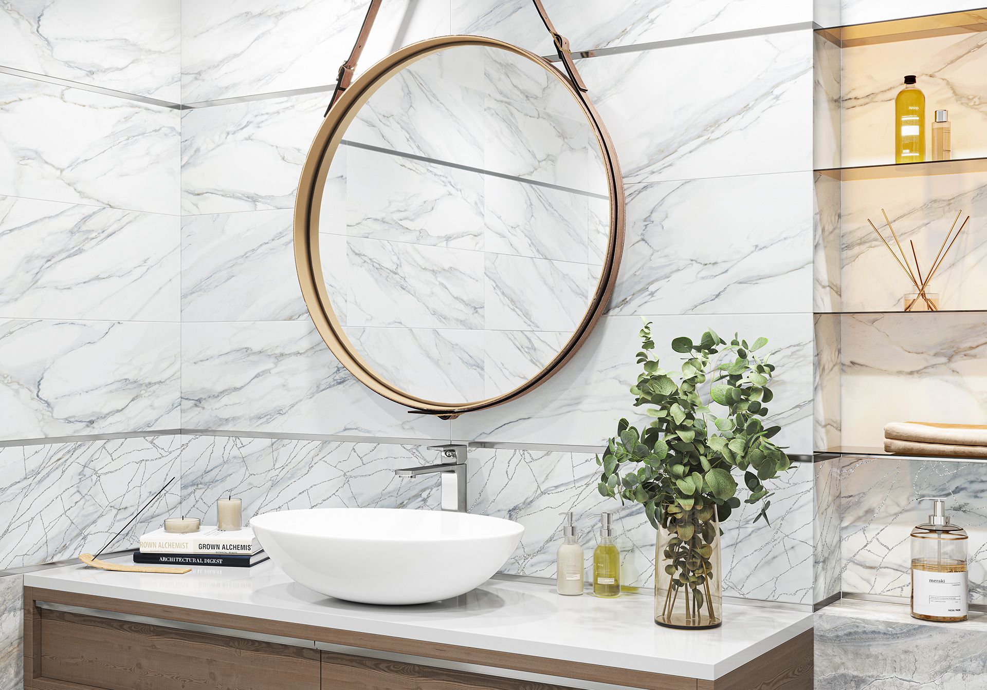 Современное прочтение мраморных текстур воплощено в коллекции Alicante. Белый камень статуарио с голубыми и теплыми прожилками и многоцветный индонезийский мрамор с глубокой текстурой дополняют друг друга и сочетаются между собой по тональности. Акцентным элементом коллекции выступает витиеватая сетка из белого золота с мерцающим глиттером. Этот декор стыкуется и создаёт в интерьере современный разноразмерный узор, который переливается и играет от лучей света, направленных на него. Дополнением является металлический стик и напольный керамогранит 410×410 мм.