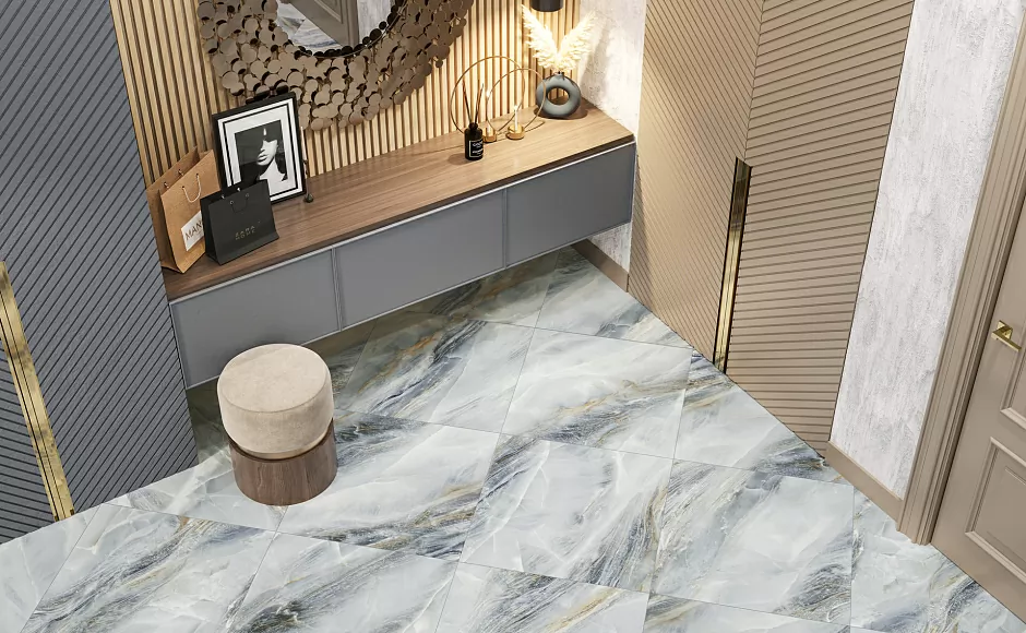 Оригинальный оникс с активными разломами неоднородной текстуры выполнен в двух оттенках: кофейно-кремовом и сизо-голубом. В каждом цвете присутствуют многоцветные градиенты текстуры, поэтому такой керамогранит смотрится объемно, а большое разнообразие рисунков и мягкое мерцание лаппатированной поверхности позволит создать неповторимый дизайн в интерьере.
