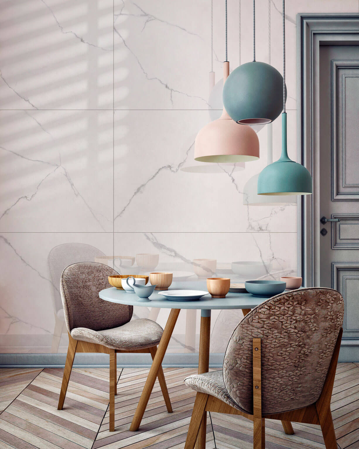Коллекция керамогранита Romantic с имитацией белого мрамора придаст любому интерьеру флёр дворцовой роскоши и первозданной чистоты. Белый фон и изящные росчерки серых прожилок создают идеальную базу для сочетания с различными материалами – древесиной, камнем, металлом, бетоном, стеклом, текстилем. Такая универсальность позволяет использовать керамогранит Romantic для оформления жилых и общественных помещений: от ванной и туалета до гостиной и спальни, от зала ресторана до конференц-зала бизнес-центра или вестибюля Метрополитен-опера. Белоснежные плиты создают невероятную энергетику, наполненную светом и простором. Рисунок, вдохновленный самой природой, имеет 6 вариаций, что дает возможность сохранить естественность натурального мрамора при укладке.