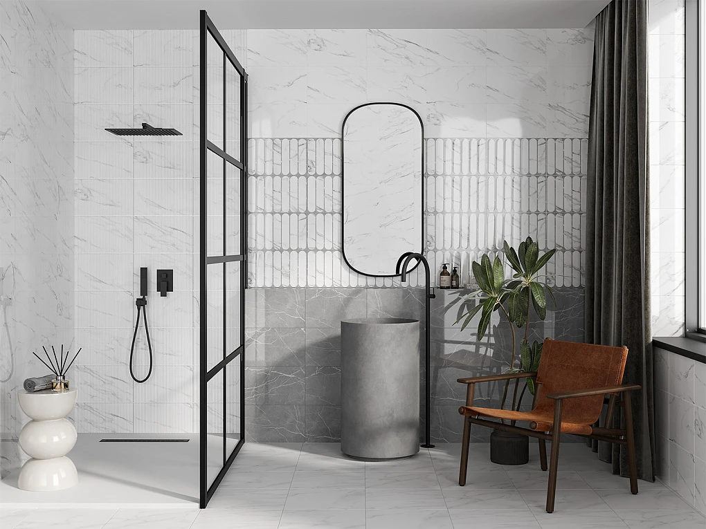 Коллекция «Арко» представляет собой идеальное сочетание античной классики и современного стиля. Название коллекции акцентирует внимание на арочных формах, которые особенно заметны на декоративном фоне. Замкнутая аркообразная геометрия, представленная в двух рельефах – крупном и мелком – напоминает каннелюры, характерные для ионического ордера. Классическую атмосферу подчеркивают базовые глянцевые плиты с текстурой мрамора. Коллекция станет идеальным выбором для тех, кто ценит сочетание классического дизайна с современными тенденциями.