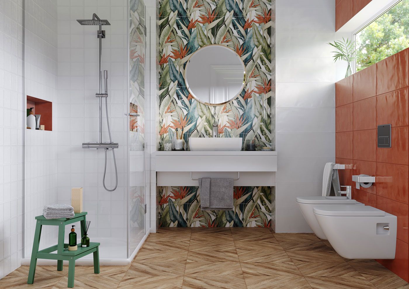 Манго / Mango от Gracia Ceramica - коллекция керамической плитки для ванной комнаты. Африканская страсть и яркость вельда – коллекция Mango: главный тренд этой коллекции – дерзкий тропический паттерн. Глянцевая поверхность, напоминающая ручную лепку, обеспечит необычные визуальные эффекты, а насыщенный оттенок спелого манго и сияющий белый с имитацией мелкоформатной плитки в сочетании с керамогранитом «под дерево» позволяют экспериментировать с цветом и настроением. Панно из 3 плит дополнит замысел: тропический цветок стрелиция, обрамленный зеленым и хаки, украсит любую вертикальную поверхность. Важно, что панно стыкуется и по вертикали, и по горизонтали – это дает возможность выкладывать его на большую площадь. Настенная плитка Mango имеет матовую поверхность.