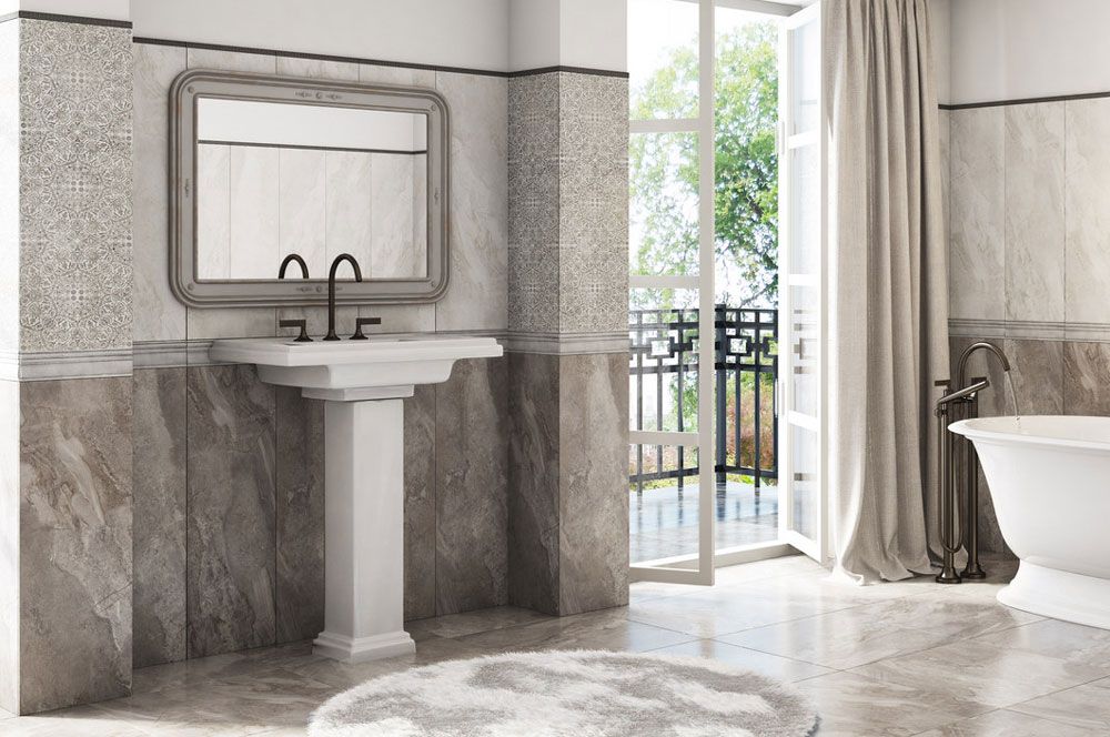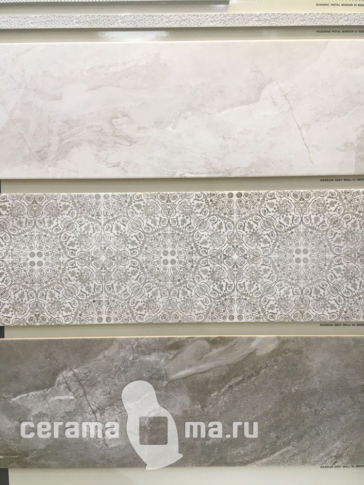 Наделва / Nadelva от Gracia Ceramica - коллекция керамической плитки 30х90 см для ванной комнаты, в оттенках серого цвета. Коллекция Ginevra сочетает в себе торжественность классического мрамора в двух оттенках серо-бежевого цвета. Теплая коллекция Nadelva в серо-бежевом оттенке, покрытая сахарной глазурью, создана для интерьера в стиле модерн. Классический и элегантный, если Вы выбираете бордюр и вставку в виде рамки. Или изысканно-дерзкий современный, если Вы предпочтете горизонтальный бордюр под металл. Плитка Nadelva имеет матовую поверхность.