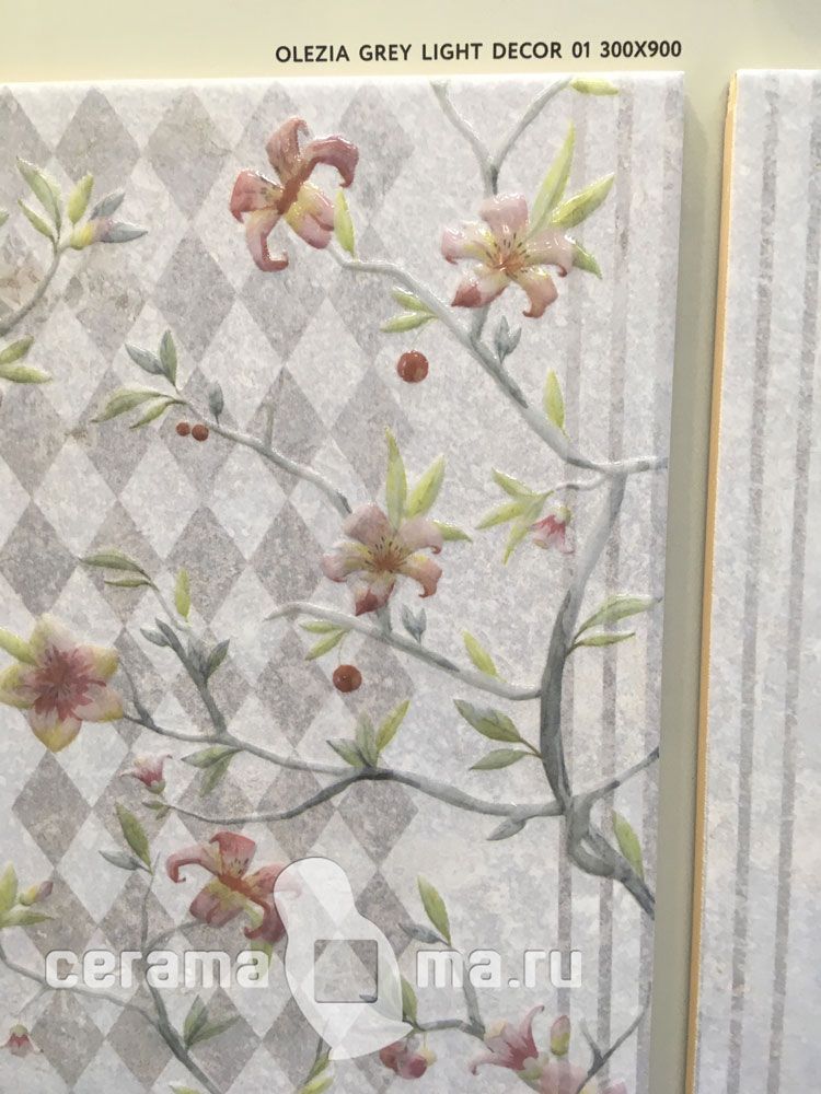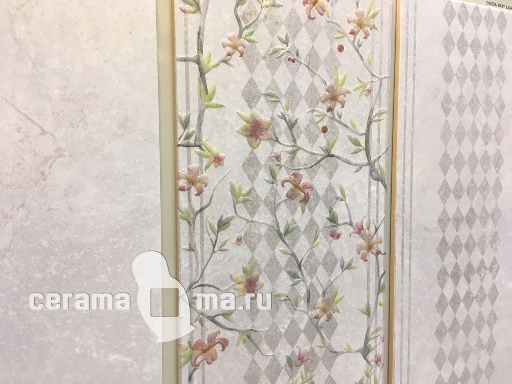 Olezia от Gracia Ceramica - новинка 2018, коллекция керамической плитки 30х90 см и керамогранита 60х60 см для ванной комнаты, под камень в оттенках серого цвета. Приятный подарок ценителям эко-стиля – с коллекцией Olezia он стал еще более роскошным и утонченным благодаря использованию камня Clamshell (раковина моллюска). Растительный принт, ветроза на алых цветках и зелень лепестков, придающая изображению 3D-эффект, не просто оживляют интерьер, но и погружают Вас в атмосферу самых затерянных райских уголков и пляжей нашей планеты. Плитка Olezia имеет матовую поверхность.