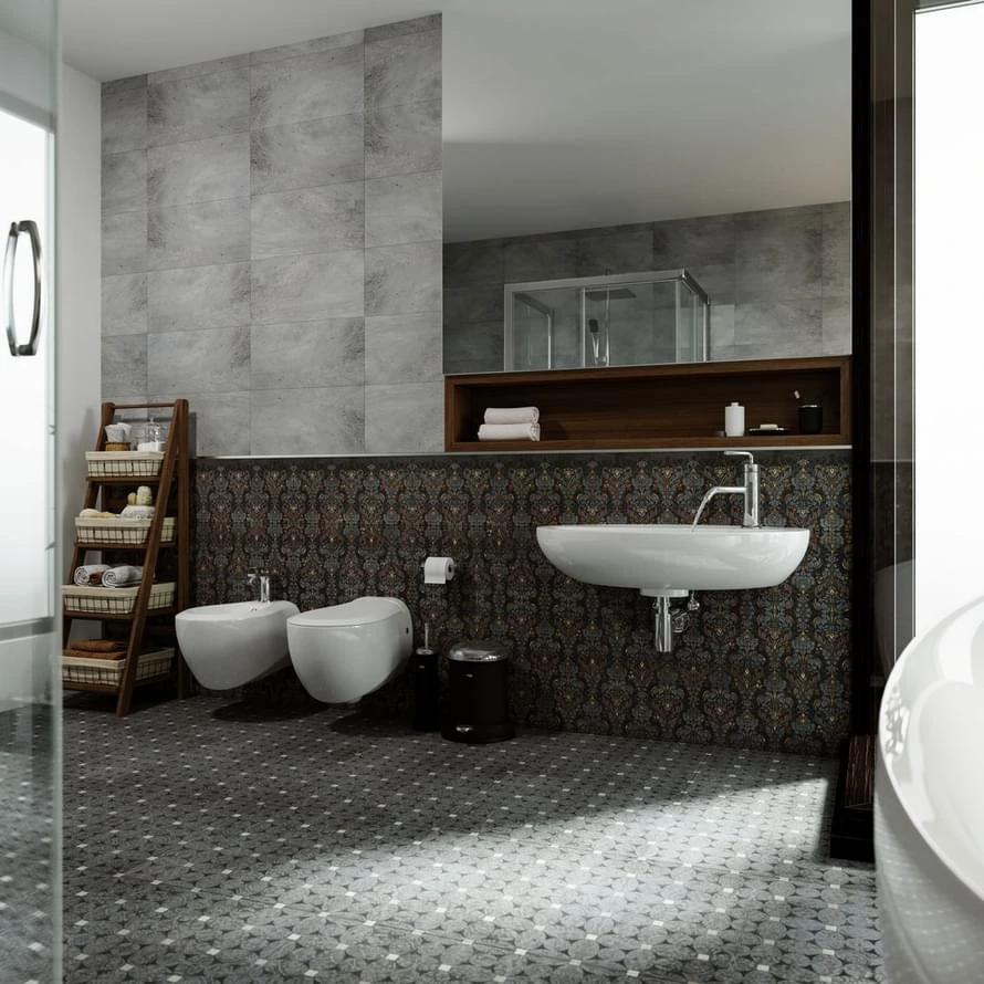 Richmond / Ричмонд от Gracia Ceramica - коллекция керамической плитки, керамогранита формата 30х60 и 60х60 см, толщиной 10 мм, в оттенках серого, графитового цвета. Эклектика, одно из актуальных направлений в современном дизайне, позволяет нам создавать необычные решения на стыке минимализма и роскоши. В коллекции Richmond гармонично сочетаются простая фактура природного камня и насыщенные богатые декоры, мотив которых создавался художниками вручную. Это придает интерьеру истинно королевский шик. Глянцевые чернила на матовой глазури делают «золотой» рисунок ажурным и объемным.