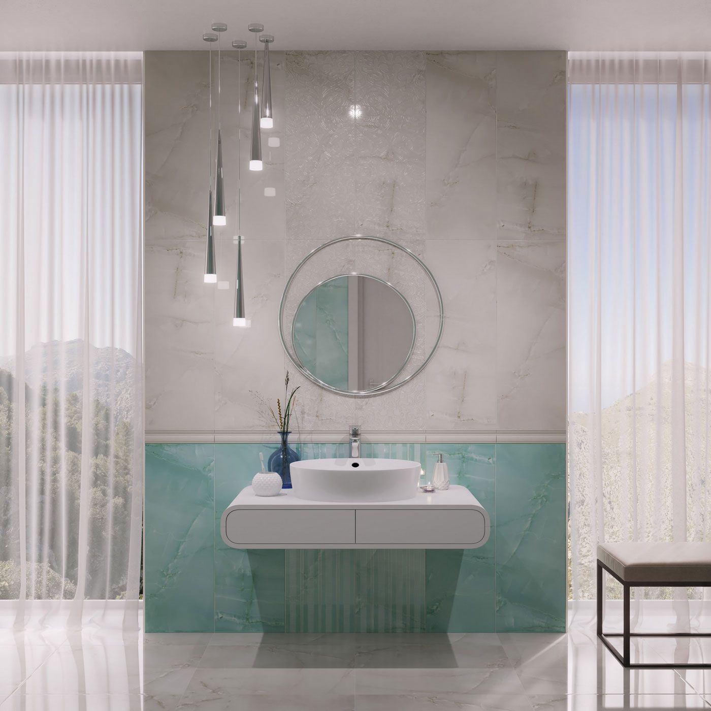 Стация / Stazia от Gracia Ceramica - новинка 2018, коллекция керамической плитки 30х90 см для ванной комнаты, под камень, в оттенках голубого, зелёного, бежевого цветов. Лазурный берег – это всегда «немного больше, чем». Больше солнца, чем где бы то ни было. Больше роскоши, чем в любом другом месте. Более яркое утро и более романтические ночи. Окажитесь на своем лазурном берегу в окружении драгоценностей из оникса с коллекцией Stazia! Тонкие перламутровые линии и классический объемный бордюр, осыпанный золотой пудрой, превращают интерьер в настоящий шедевр. С ними ванная комната создает позитивные впечатления и всегда смотрится достойно! Плитка Stazia имеет глянцевую поверхность.