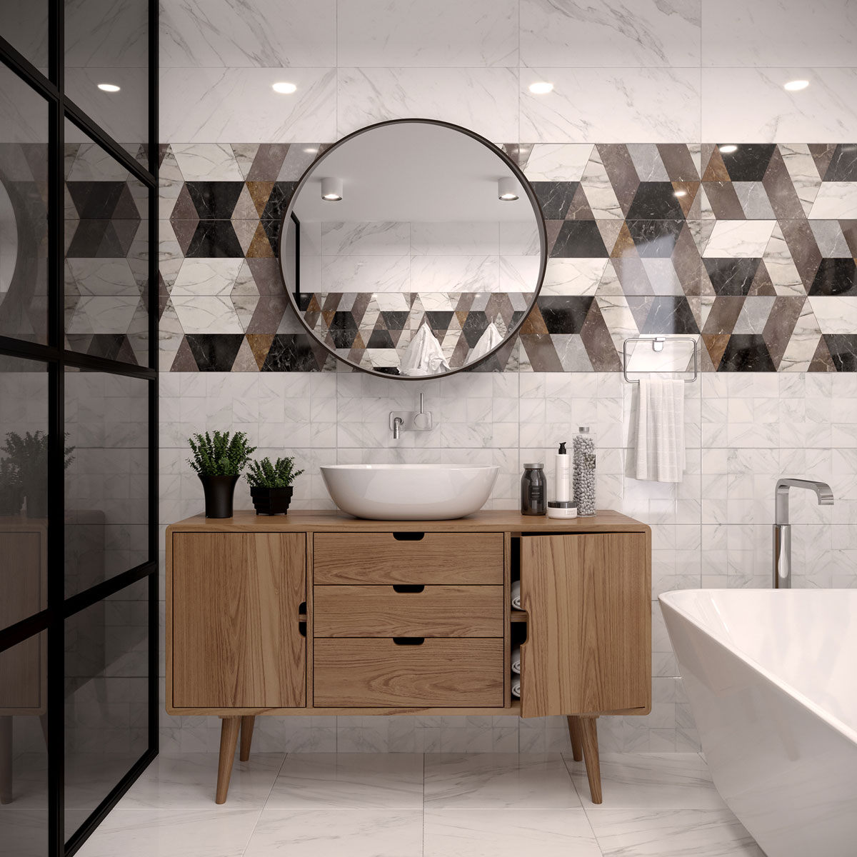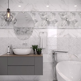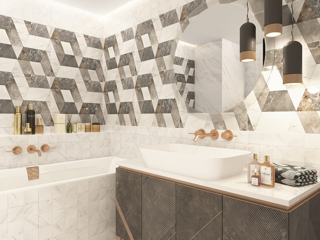 Винде / Vinde от Gracia Ceramica - коллекция керамической плитки под камень для ванной комнаты. Благородная стройность и четкость линий, продуманное пространство, скромное и шикарное одновременно, лаконичность, когда тебе уже не надо ничего и никому доказывать – все эти лучшие черты городского шика нашли идеальное воплощение в коллекции Vinde. В коллекции Vinde строгость геометрически-четкого узора насыщенных темных тонов на декоре смягчается фактурной поверхностью светлых плит: она образована небольшими мраморными разнонаправленными квадратами, которые дают удивительный эффект игры бликов при любом освещении. Контрастное сочетание благородных текстур белого и тёмных мраморов позволяют создать яркий и запоминающийся дизайн интерьера.
